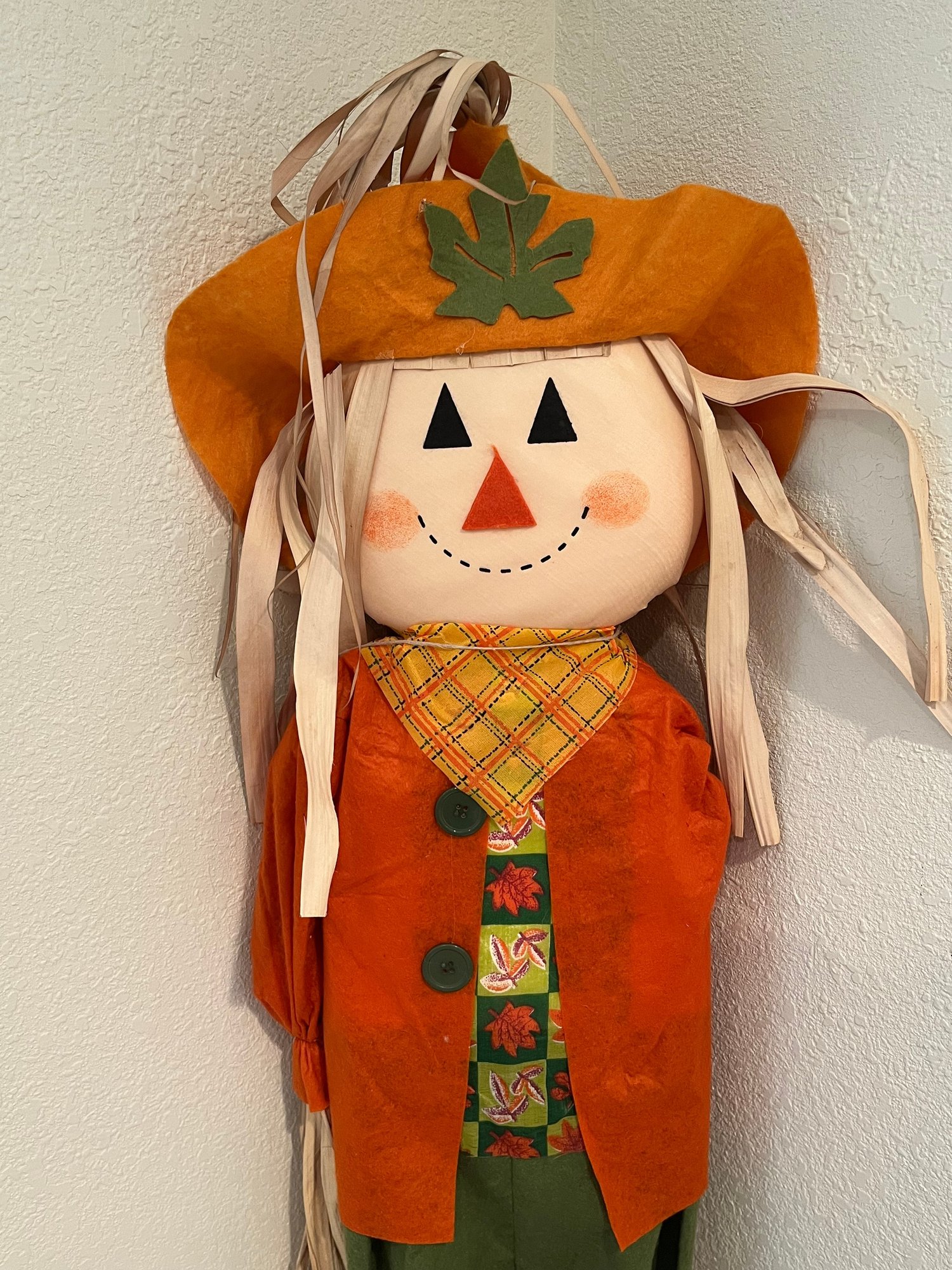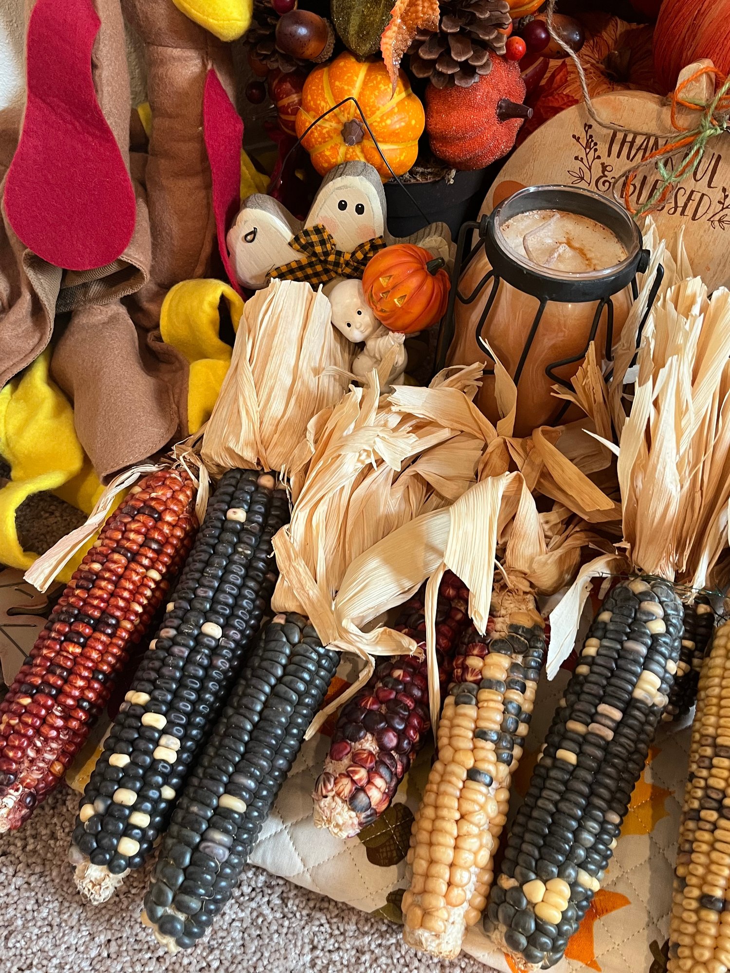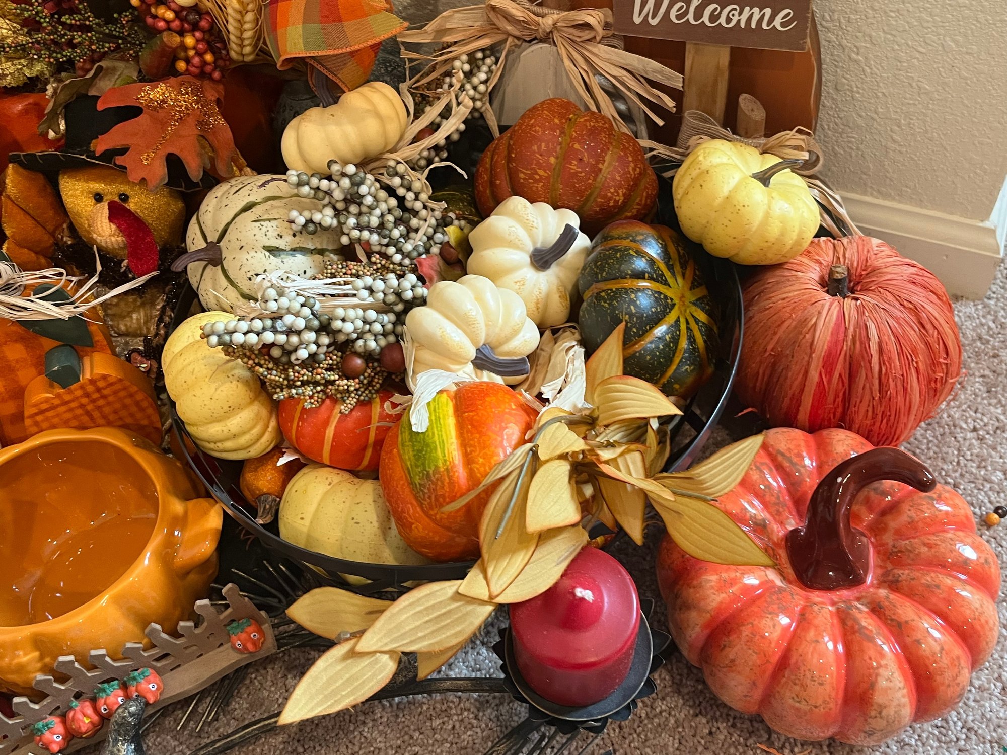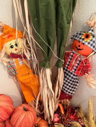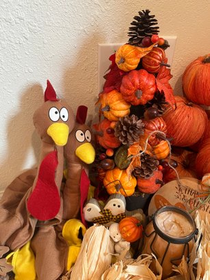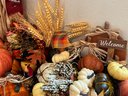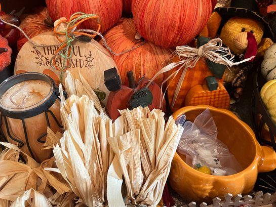 Fall Thanksgiving Holiday Decor Lot including colored corn decor, fruit basket decor, Thankful and Blessed pumpkin sign, metal seasonal candle holder, pumpkin decor, large scare crow and more. All pre owned condition.