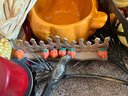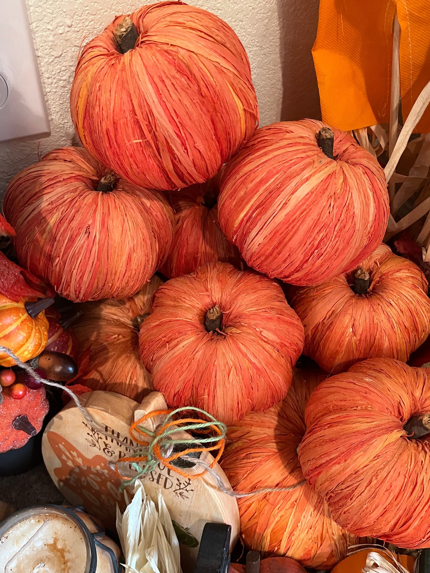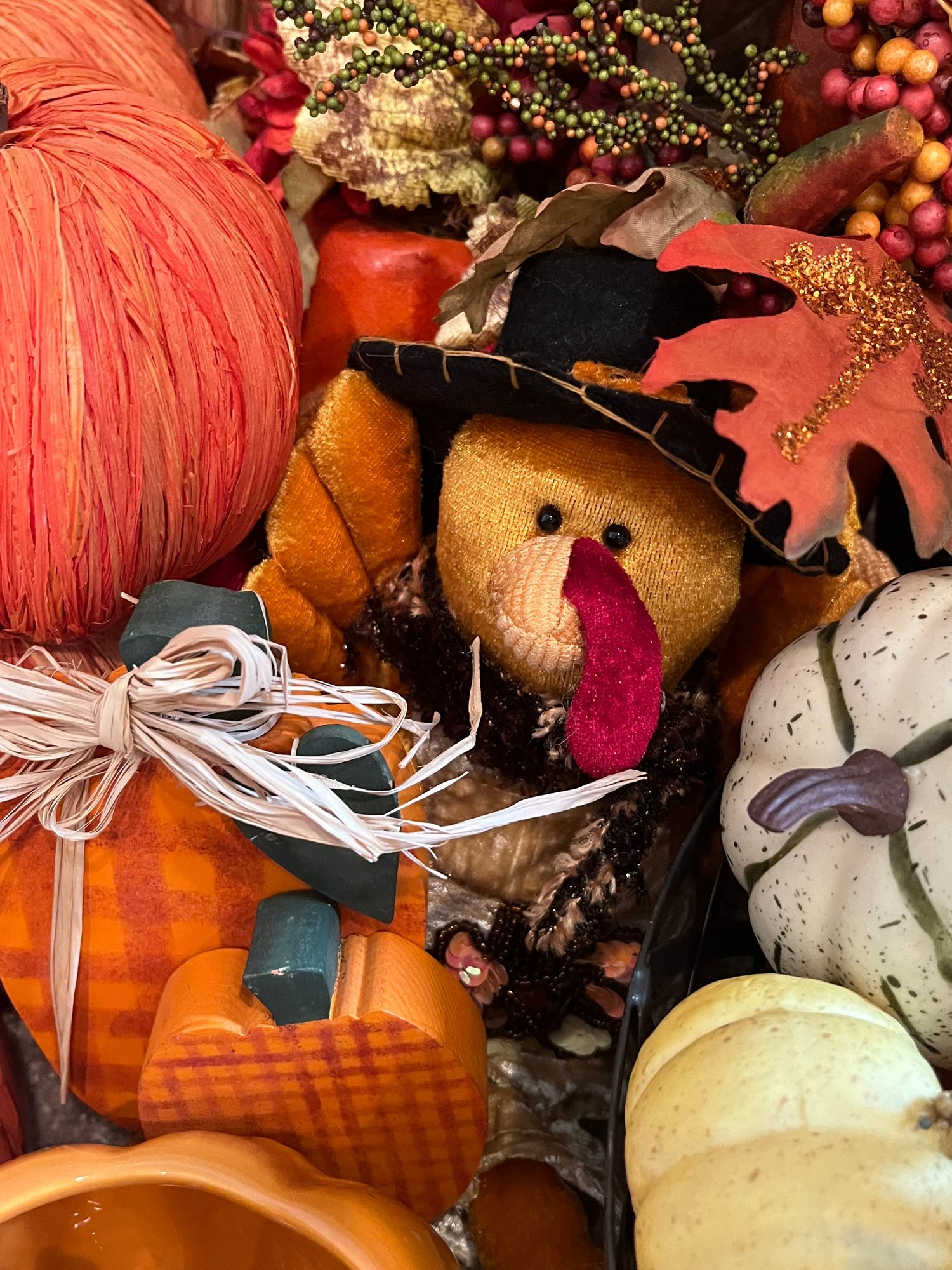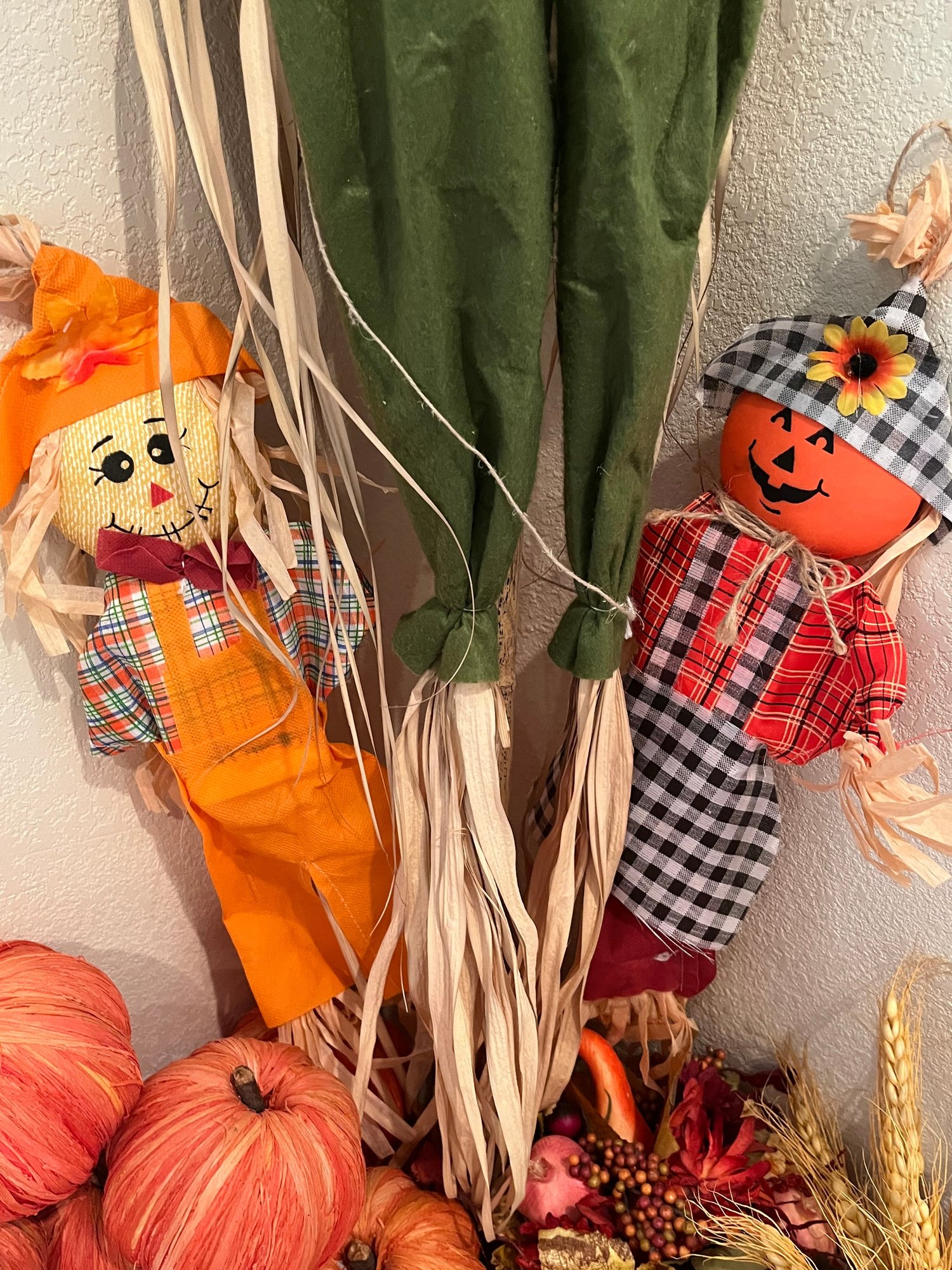Fall Thanksgiving Holiday Decor Lot including colored corn decor, fruit basket decor, Thankful and Blessed pumpkin sign, metal seasonal candle holder, pumpkin decor, large scare crow and more. All pre owned condition.