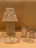 Finish It Yourself! Candle Lantern And Materials. Includes, 1 unfinished candle lantern, 1 jar of pearl and rhinestones, 1 jar of white buttons various sizes, 1 ziploc baggie of white buttons various sizes, and one ziploc baggie of hanging faux crystal decals. All pre owned condition.