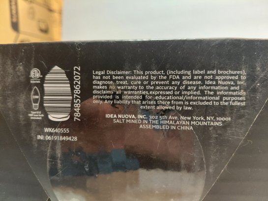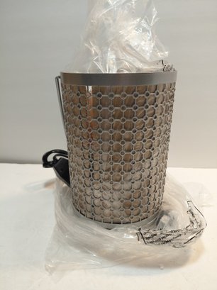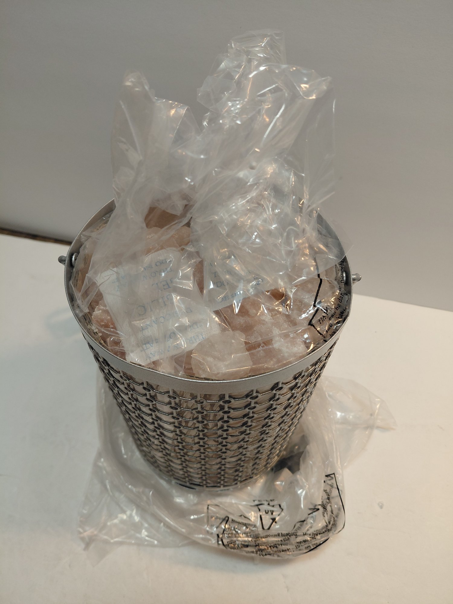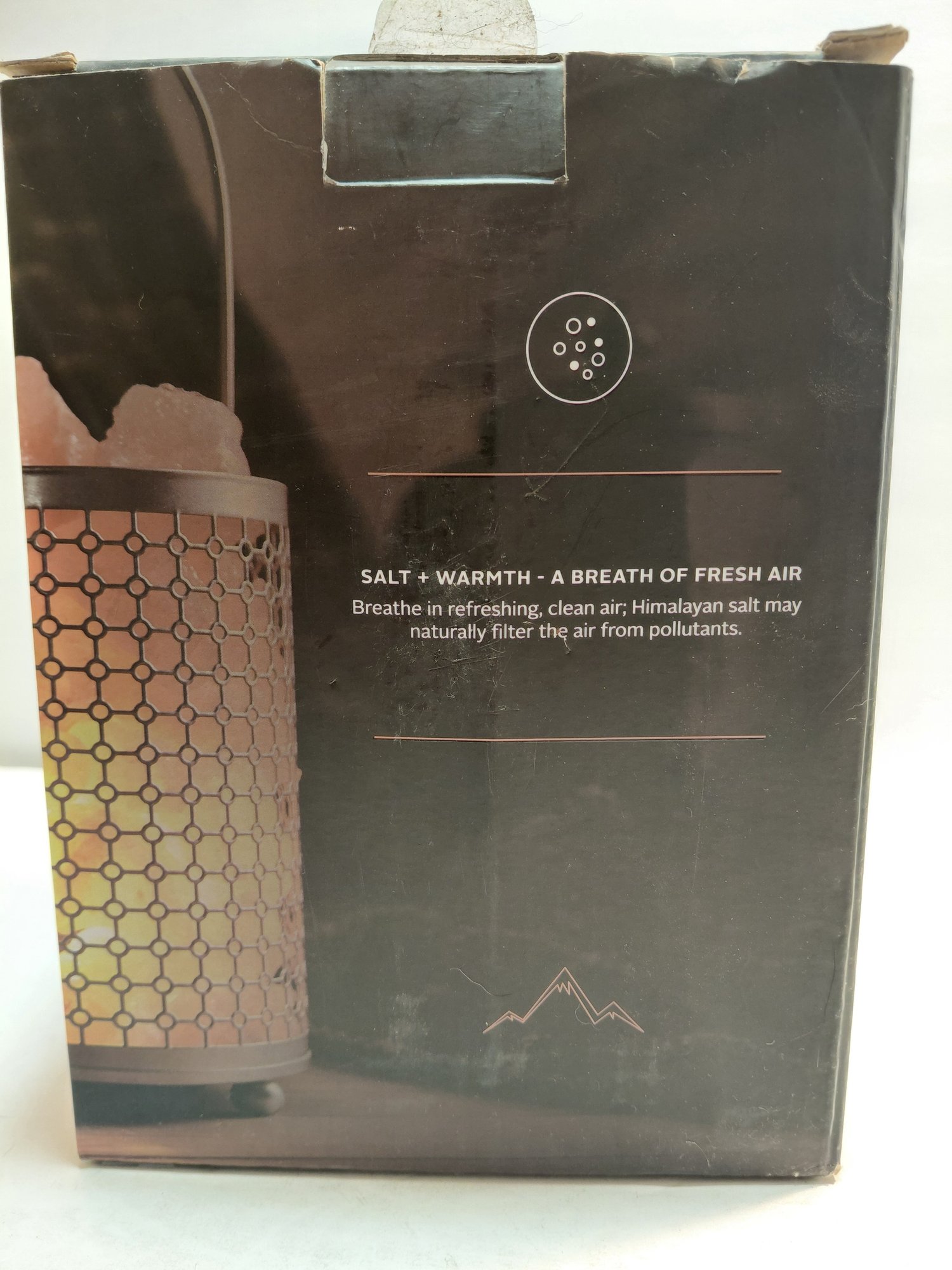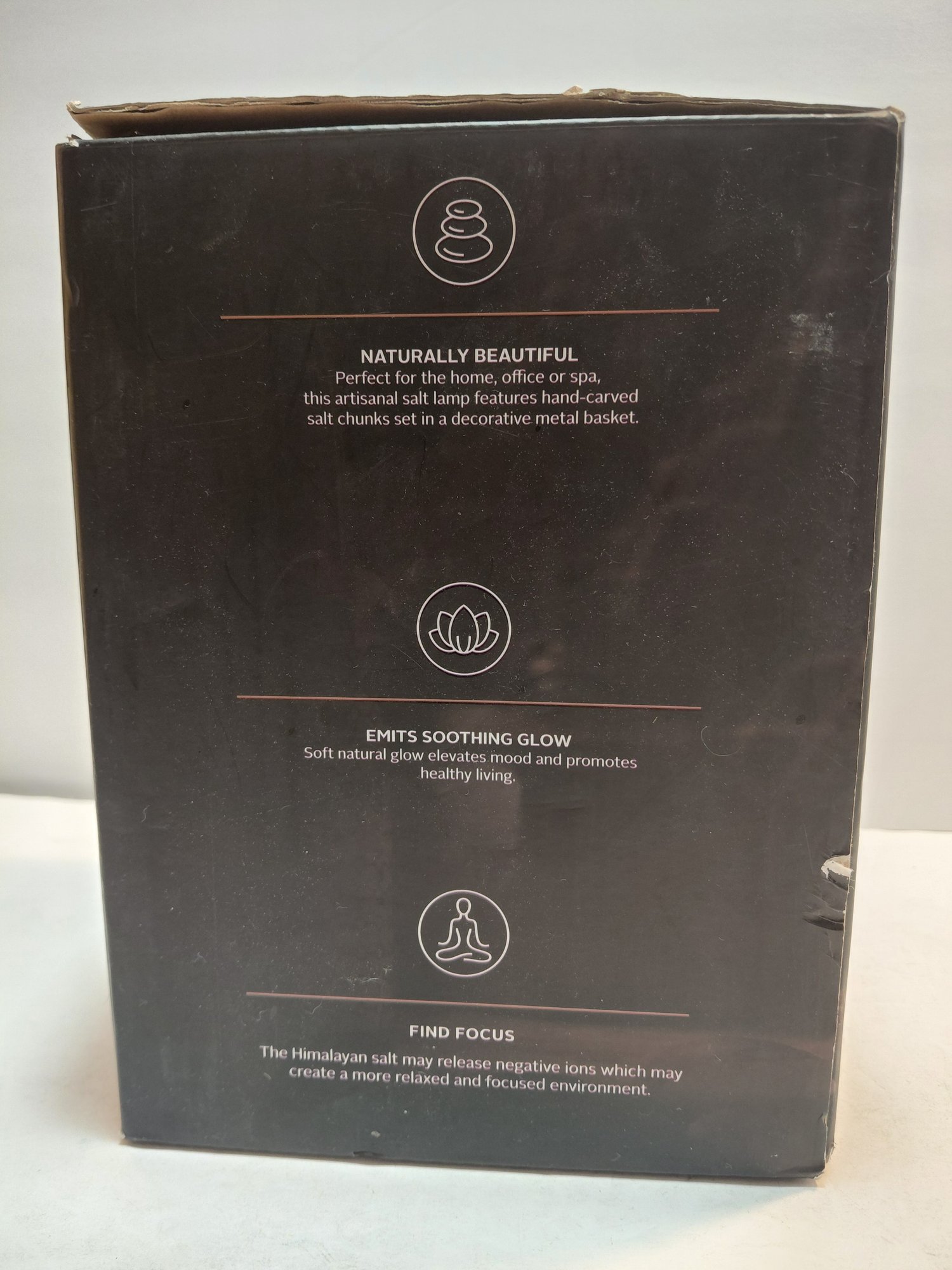 Features hand-carved pink crystal rock salt housed in a gold-colored perforated metal basket.