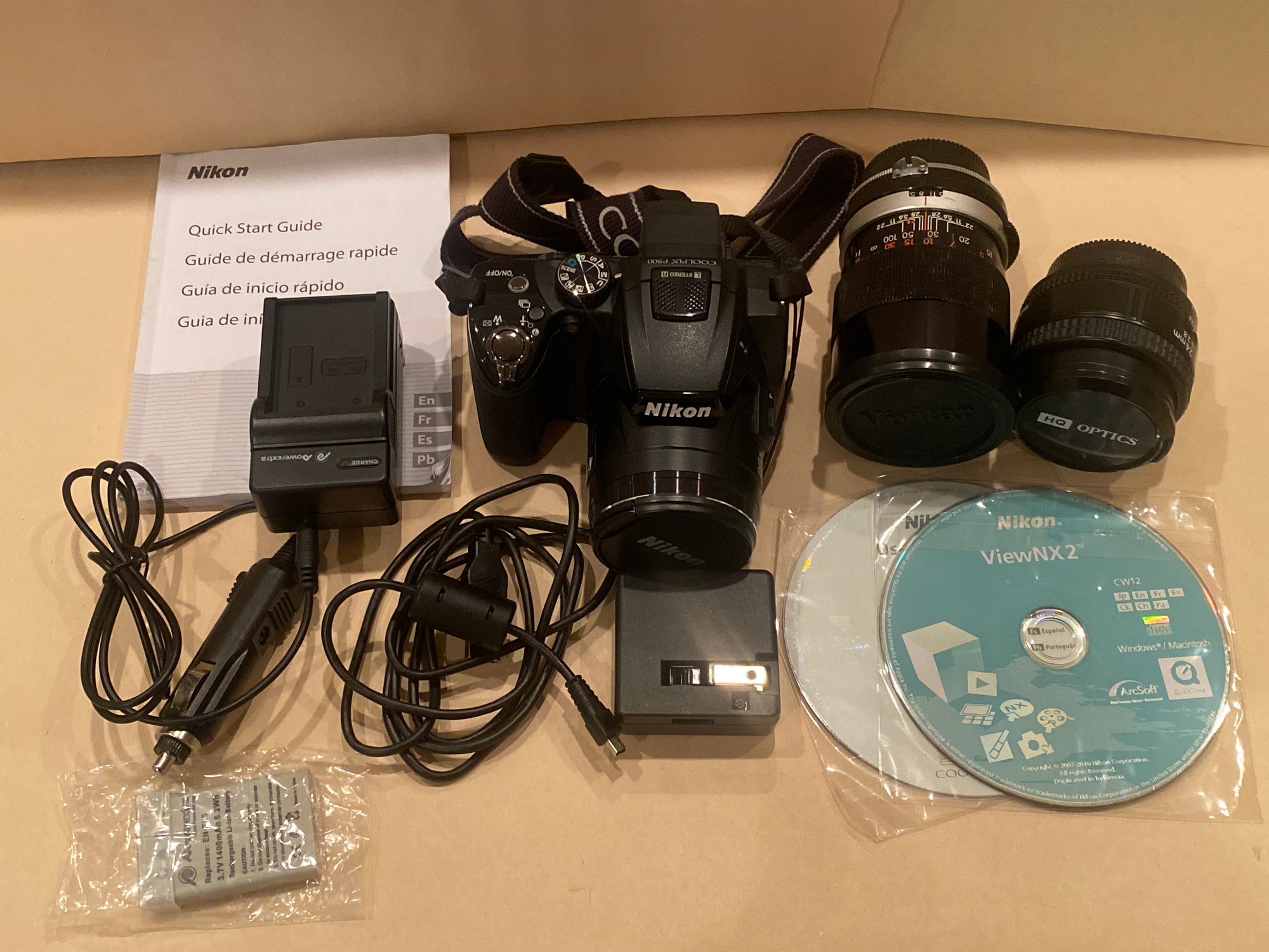 Nikon Coolpix P510 With Extra Lenses. Including 1 Nikon Coolpix camera, 2 different lenses, 1 quick start guide, 2 instructional videos, a charger for the battery and an extra battery. All inside a camera case. Not tested. All pre owned condition.