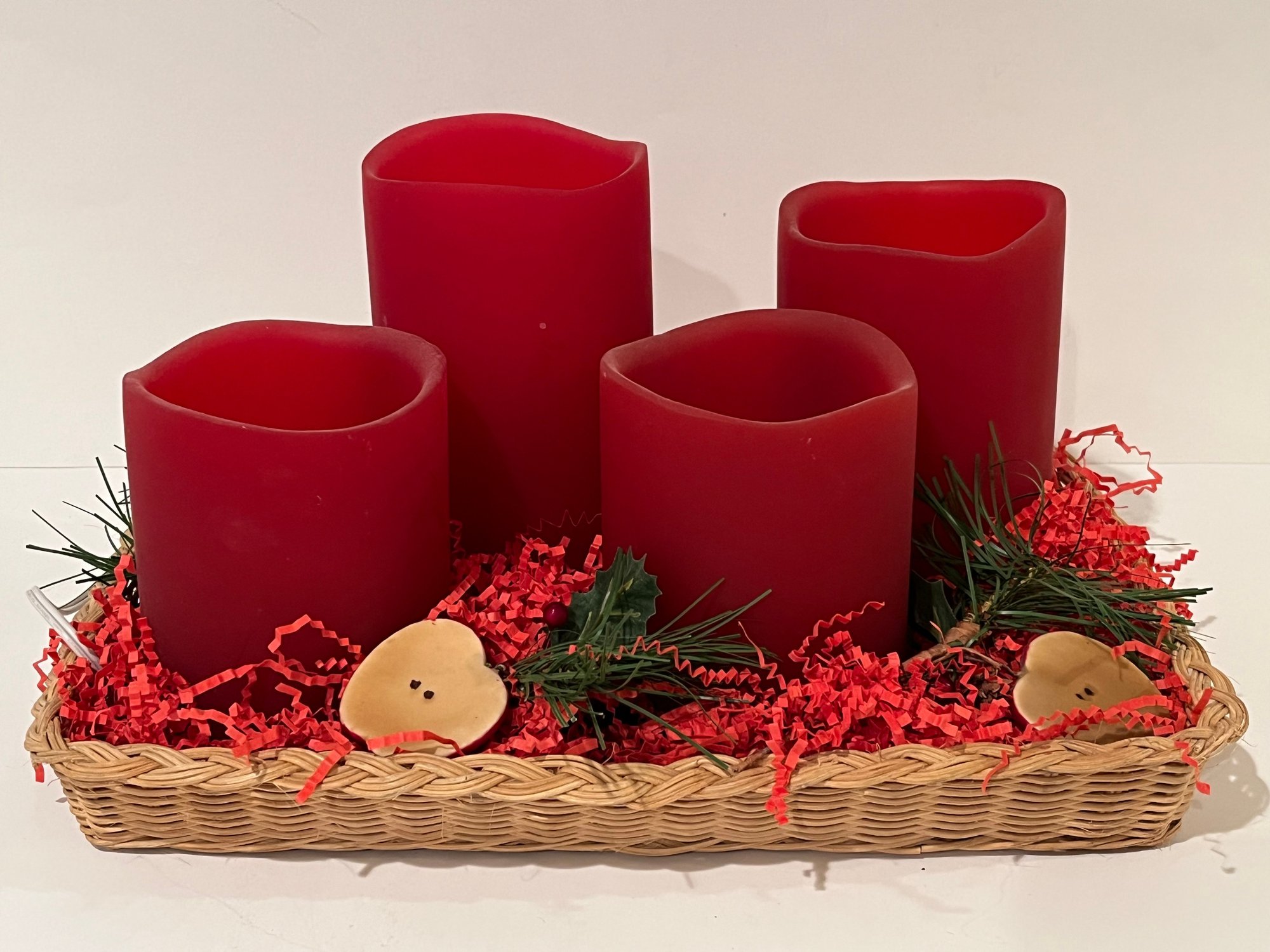 Led Candle Basket Center Piece featuring 4 red LED candles with faux apple decorations and red paper grass inside a wicker basket. Measures approximately 9”x 15”. Pre owned condition. Tested and works.