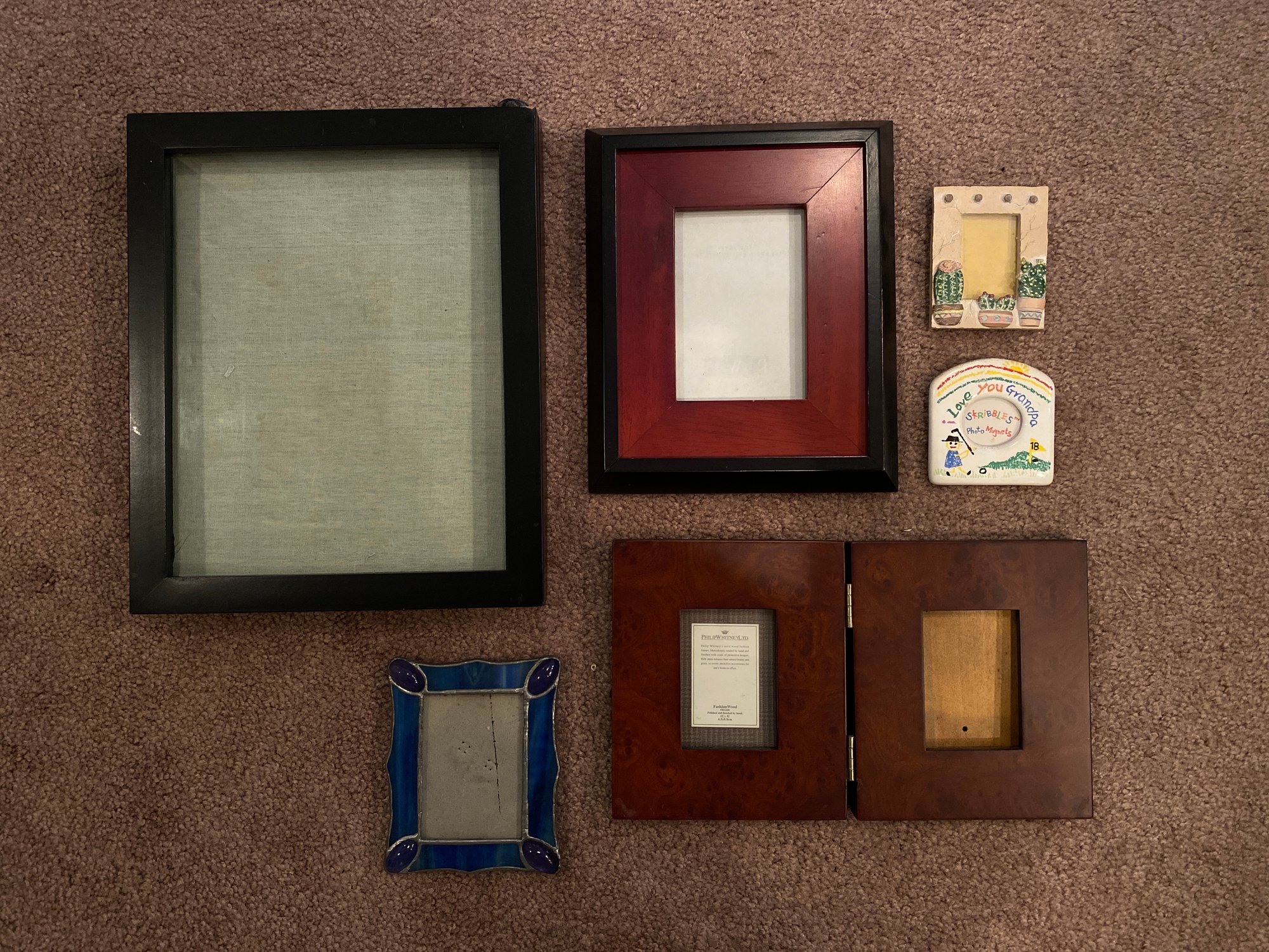 Lot Of 6 Picture Frames, various shapes, sized and designs. All pre owned condition.