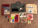 Lot Of Random Office/Craft Supplies. Including 1 empty photo album, 1 office bag, some craft paper, a few post cards, a deck of cards, a lighter, a pack of push pins a baseball bat pen and a few stencles.