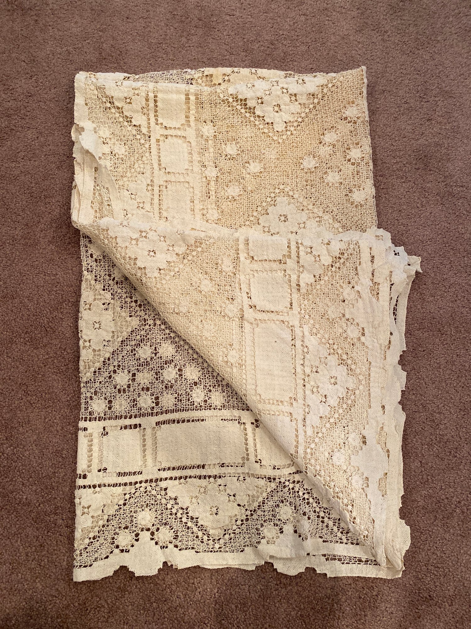 Rectangular Doily Material Tablecloth. 74”x 50”. May need to be cleaned, pre owned condition.