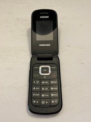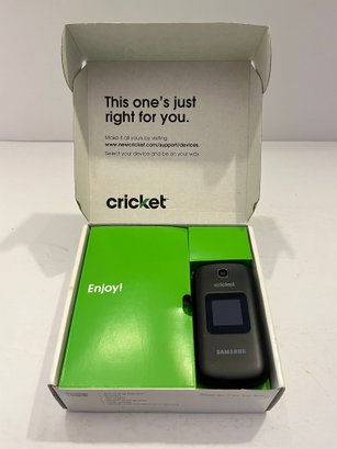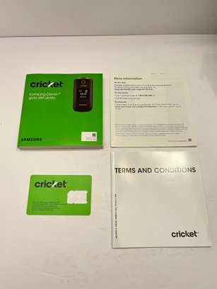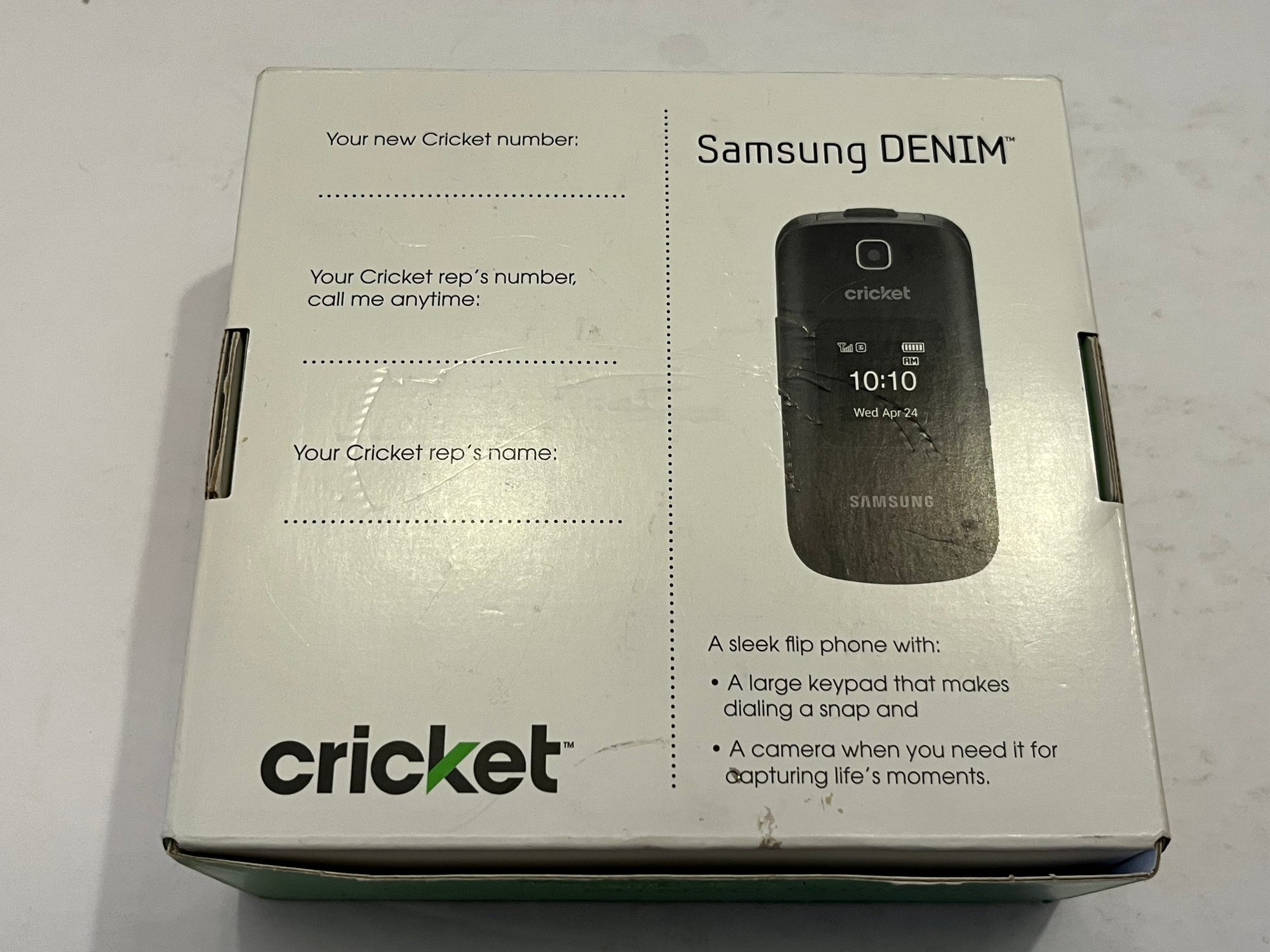 Samsung Denim SGH-A207 flip phone packaged for Cricket Wireless. It features a compact, clamshell design with a primary internal display and a small external display. It is designed for basic cellular communication, including calling and texting. Comes with charger and information packets. Pre owned condition, untested. Was not charged.
