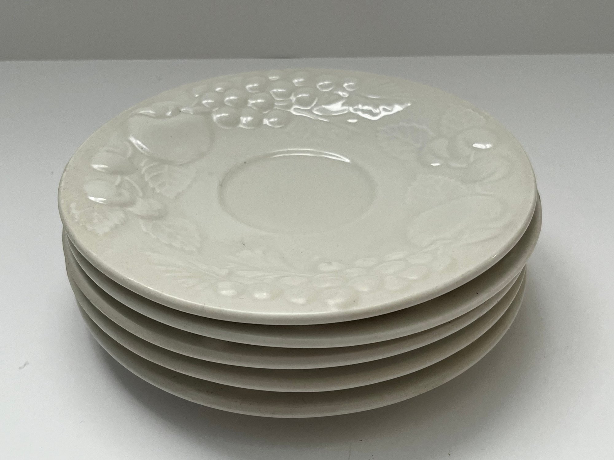 Sauvignon By S.H.I. White Harvest Pattern Stoneware Dish Set including 5 mugs, 5 tea plates and 7 large plates. Each comes with the white embossed harvest pattern. Pre owned condition, needs to be cleaned.