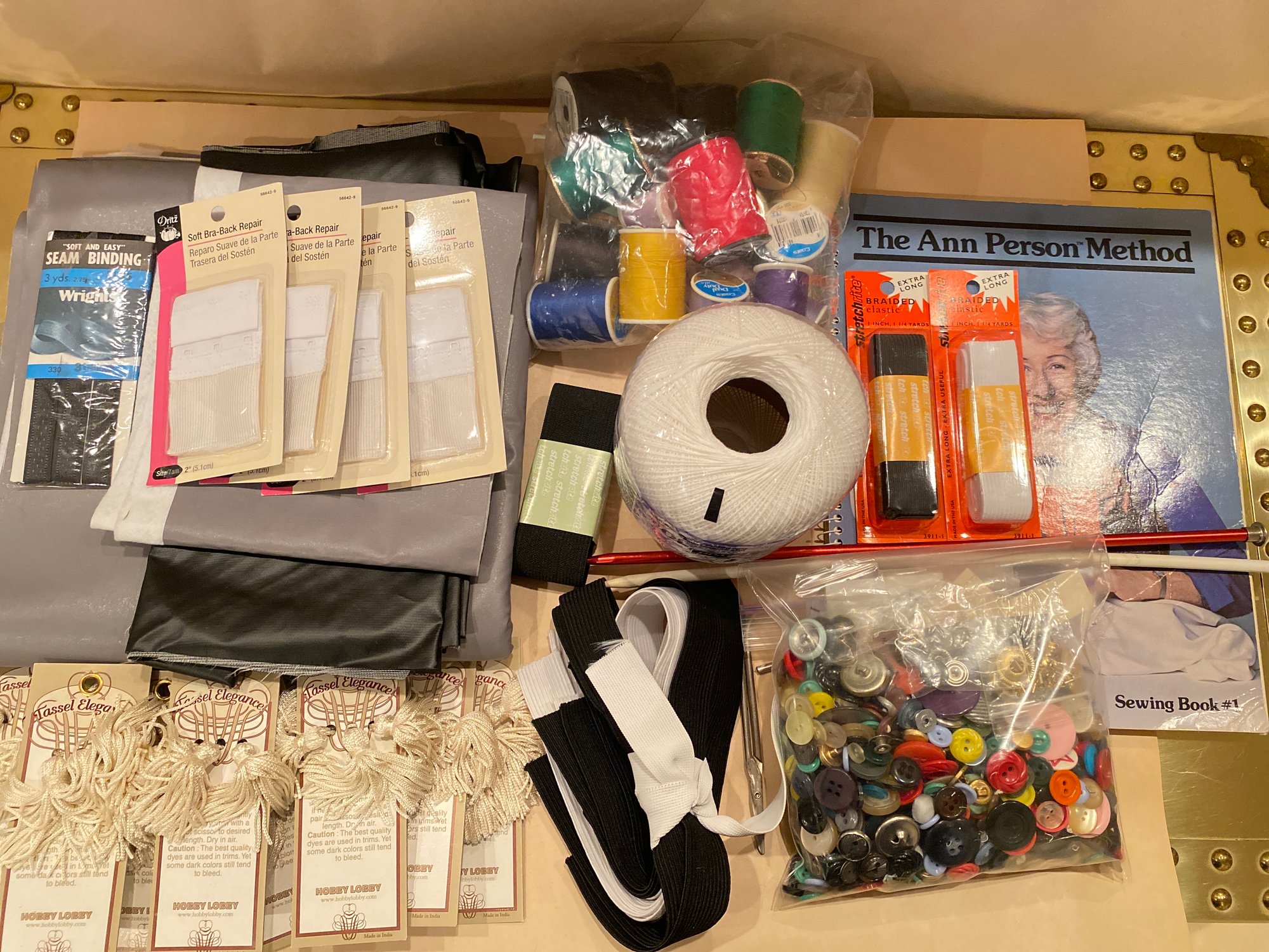 Sewing Lot includes, 1 The Ann Person Meathod sewing book, 1 spool of baby blue ribbon, 2 knitting needles, 1 pair of sewing scissors, 12 tassel decals, 4 bra fastener straps, 1 bag of buttons, 1 bag of different colored threads, 3 loose pieces of fabric, 1 spool of crochet thread, and a few short pieces of elastic. All pre owned condition.