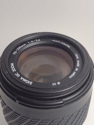 Sigma 70-210mm f/4-5.6 UC Zoom Multi Coated Camera Lens. Focal Length: 70-210mm. Aperture Range: f/4-5.6. Filter Thread Size: 52mm. Features: Multi-coated to reduce flare and ghosting and includes a macro mode. Minimum Focus Distance: 1.2m