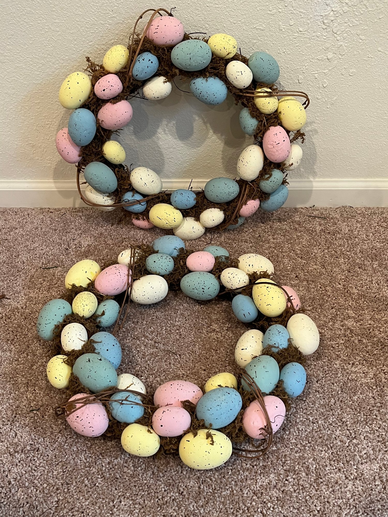 Small Assorted Easter Lot inclduing 2 large egg wreaths, 1 small egg wreath, 1 boxed just for you teddy bear, 2 TY valentine’s day beanie baby’s, 1 Peter Rabbit Gund stuffy and 1 egg cupcake tree decoration. All pre owned condition.