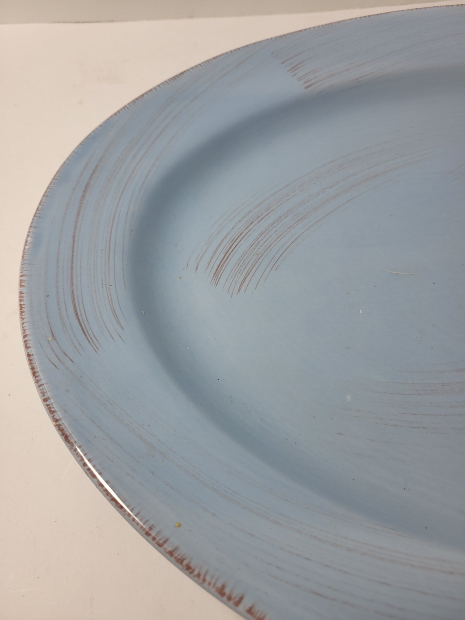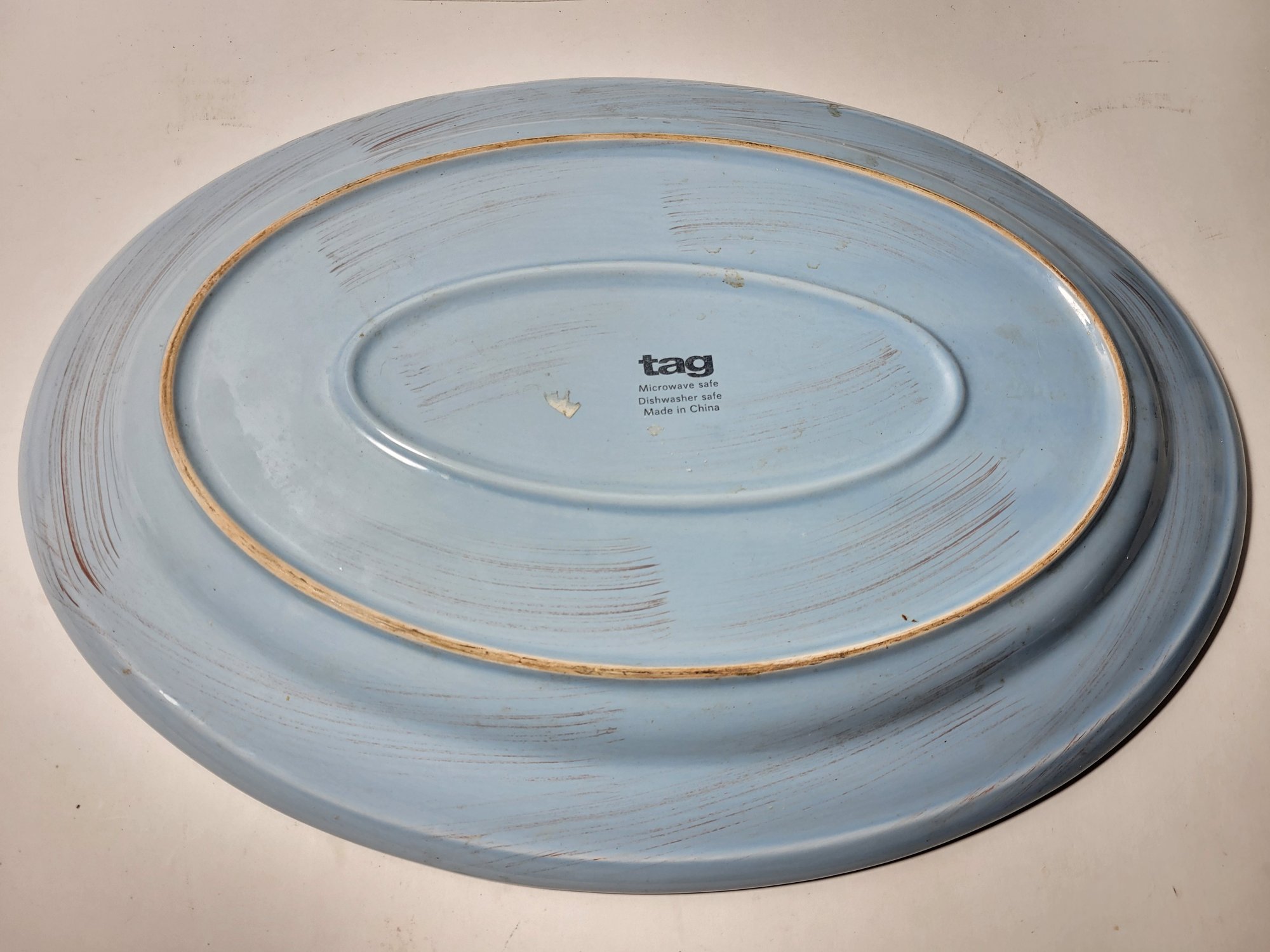 TAG Slate Blue Oval Ironstone Serving Platter. Has a brown edge and brown swirls. Measures approximately. Measures 13.5" x 18.5". Microwave and Dishwasher Safe. Pre-owned condition.