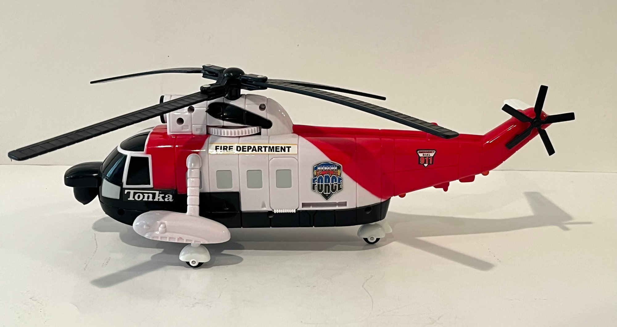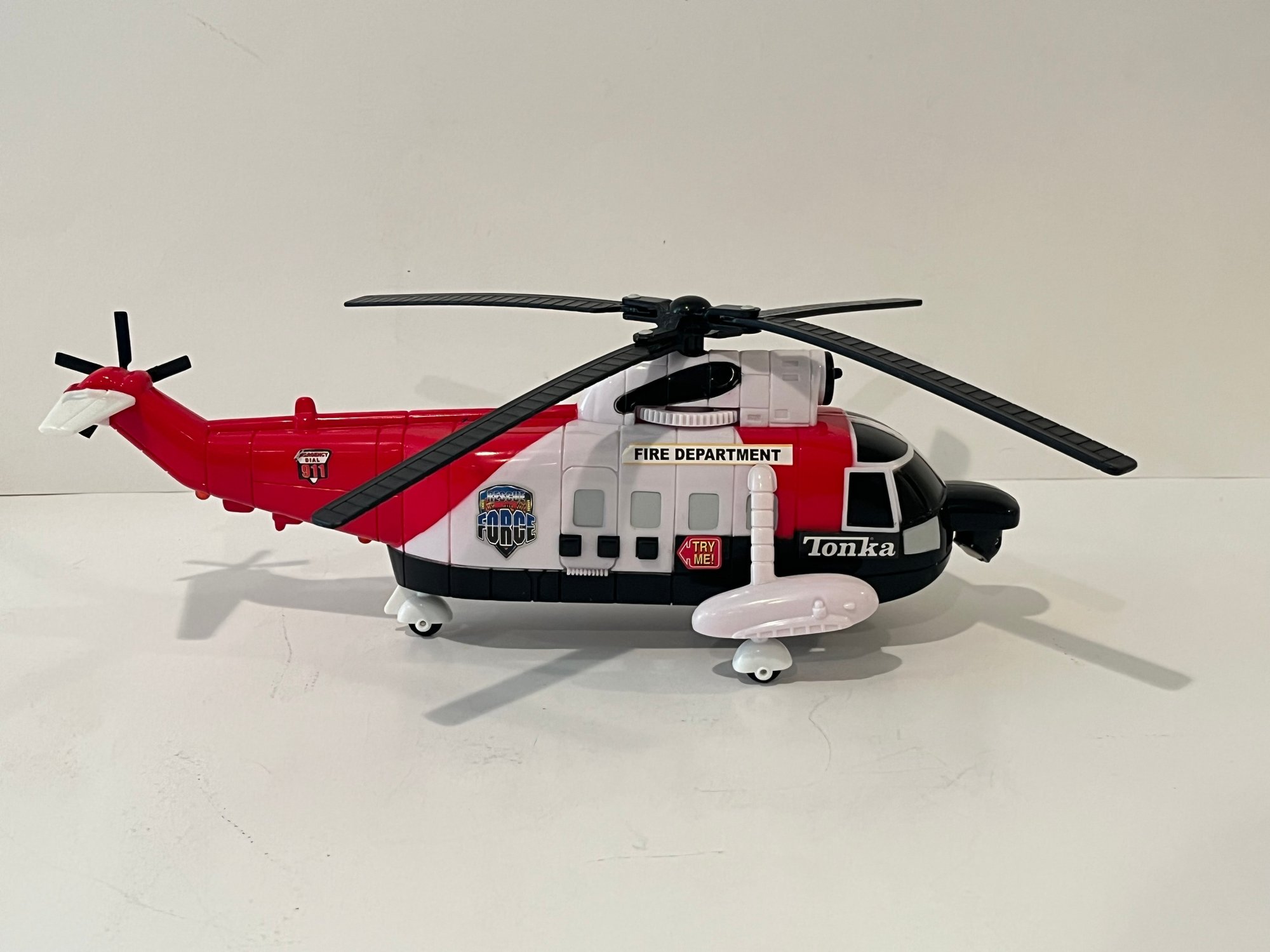 2009 Tonka Rescue Force Fire Rescue Helicopter features lights and sounds triggered by a button and adjustable spinning propellers. Measures approximately 14” in length. Pre owned condtion, buttons work.