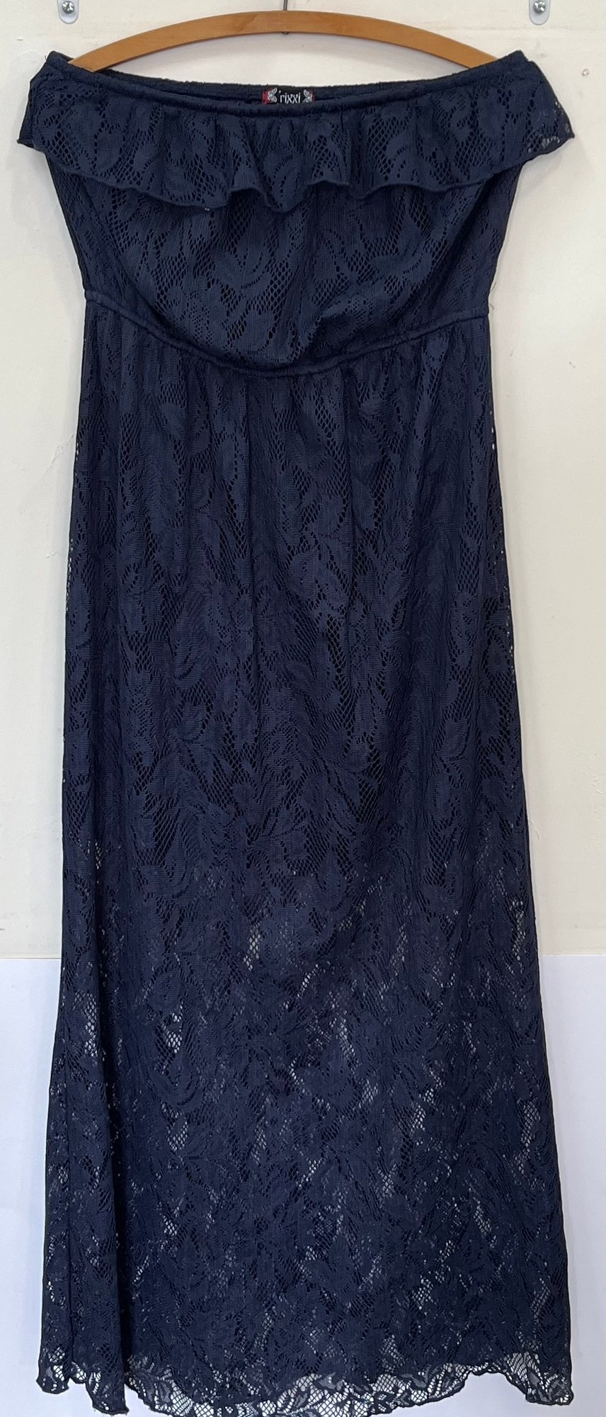 Trixxi Strapless Dark Blue Lace Summer Dress with an extra lace ruffle detail around the top line. Around mid calf length. Size L. Comes with shorter lining underneath the skirt.