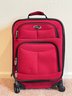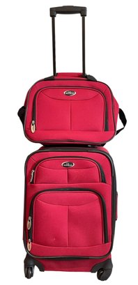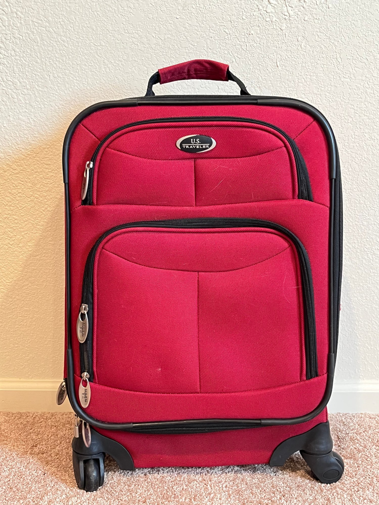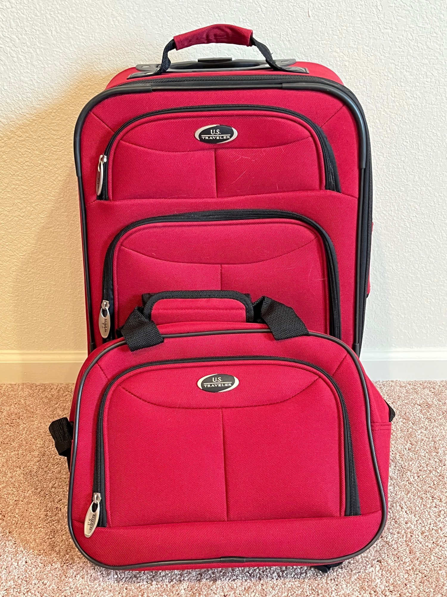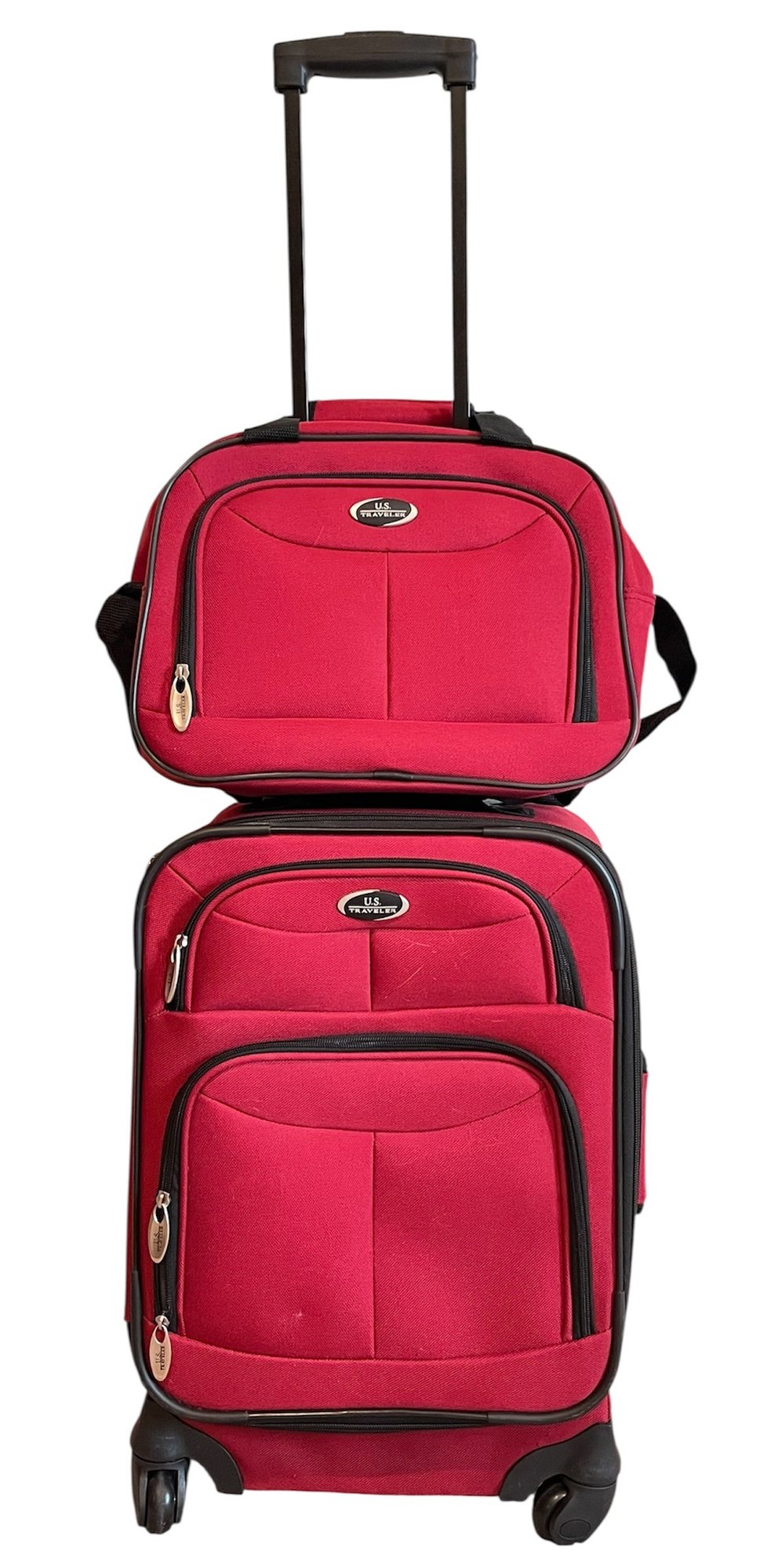 U.S. Traveler Rio 2-piece expandable carry-on luggage set. Features smooth and quiet rolling wheels with corner protectors for easy portability and durability over curbs and stairs. Including 1 smaller 11”x 14” carry travel bag and a 15”x 20” expandable rolling suitcase nothing coming in a red canvas like material. Both pre owned good condition .