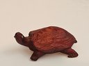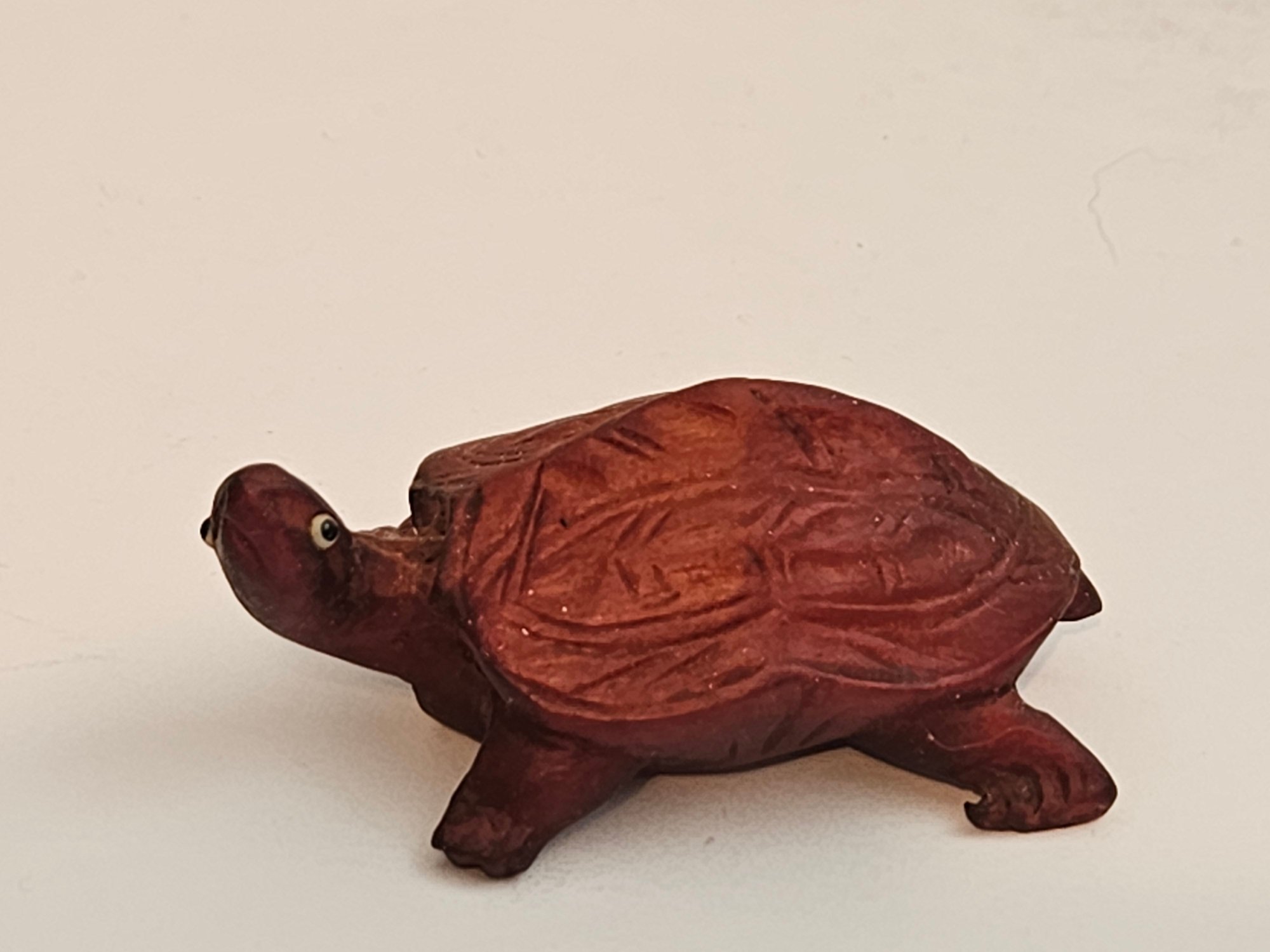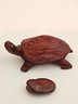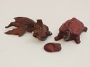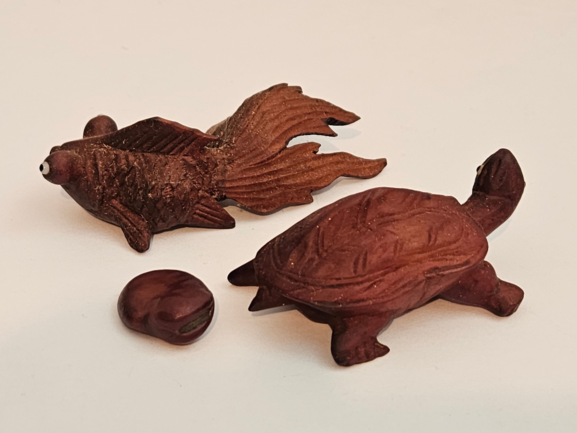 These items are small, vintage Asian-style carved wooden figurines, likely made from rosewood.