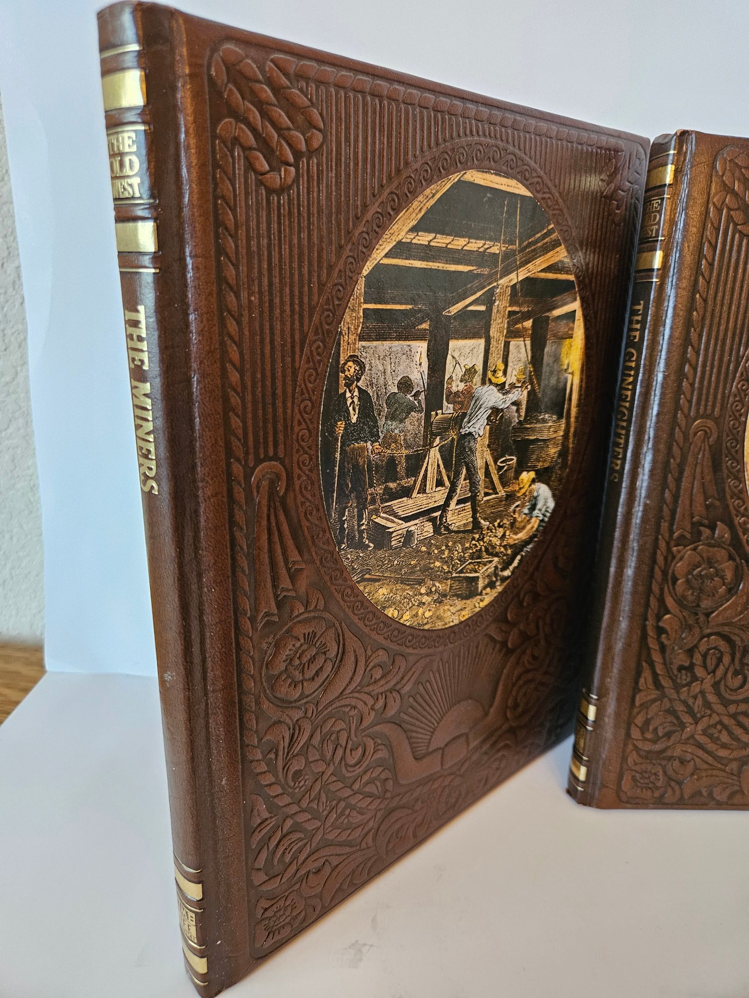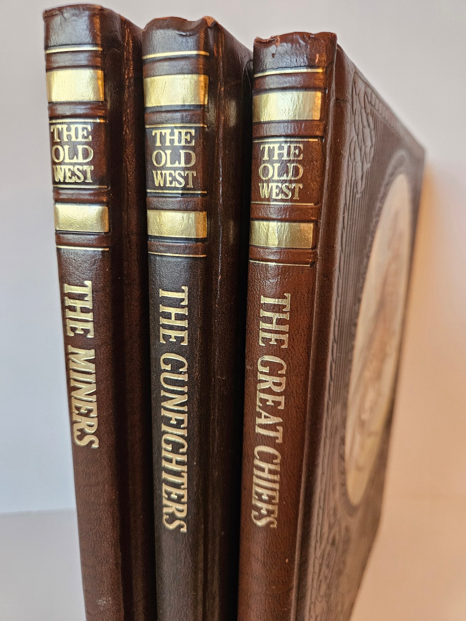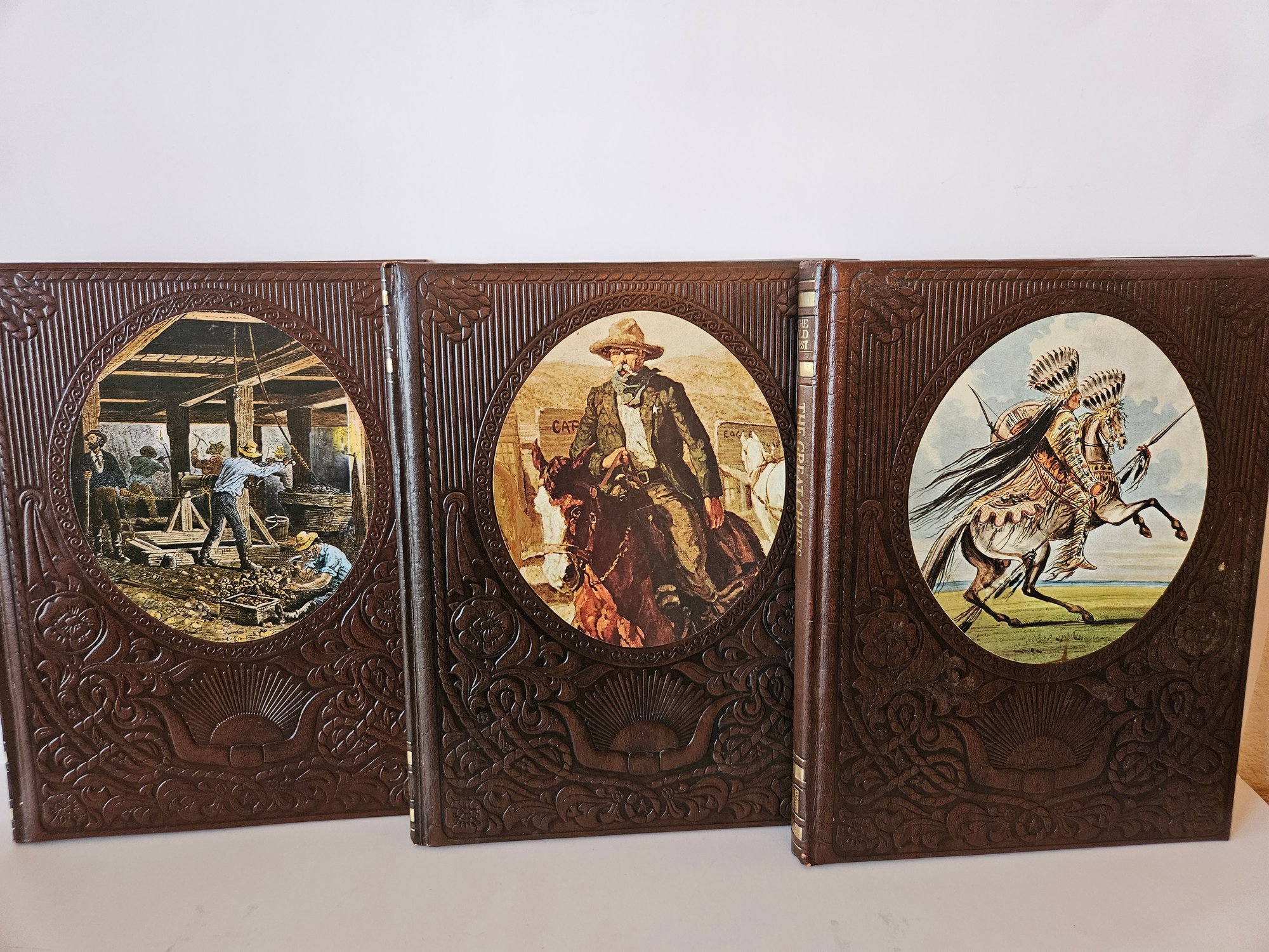 Vintage 1970's The Old West Book Lot x 5. Includes three books about the Old West by Time Life Books. The Miners, The Gunfighters, and The Great Chiefs. Also includes Trails West By The National Geographic Society and A Story of the Illustrated Centennial State. All have brown leather bound or faux leather covers with artwork or embossing. Pre-owned condition.
