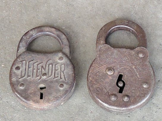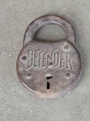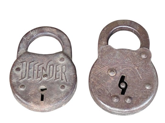 Collectible Nature: Antique padlocks, such as the "Defender" model shown on the left, are popular collectibles often valued for their historical significance, unique designs, and craftsmanship.
