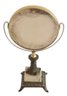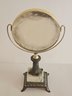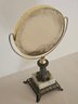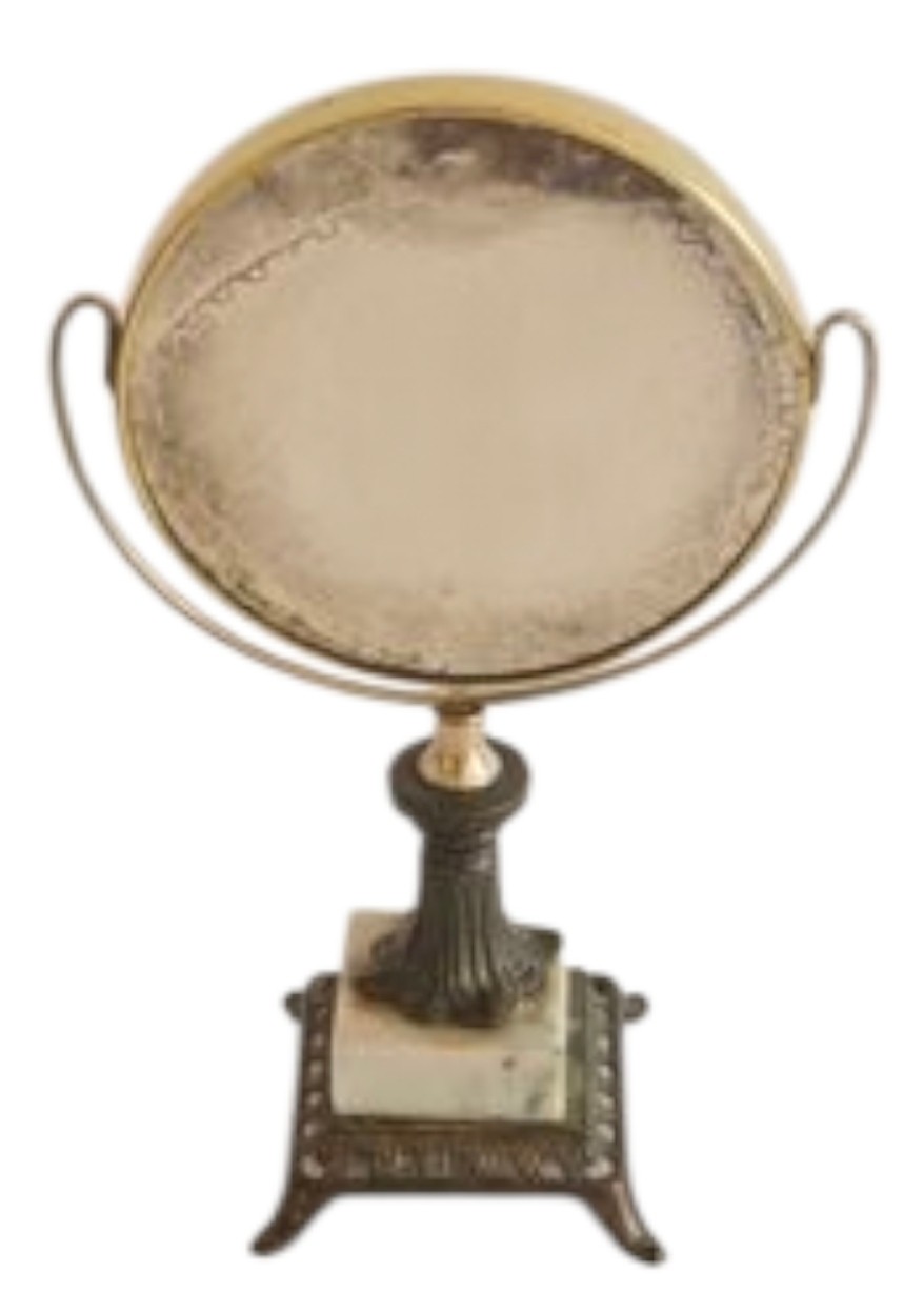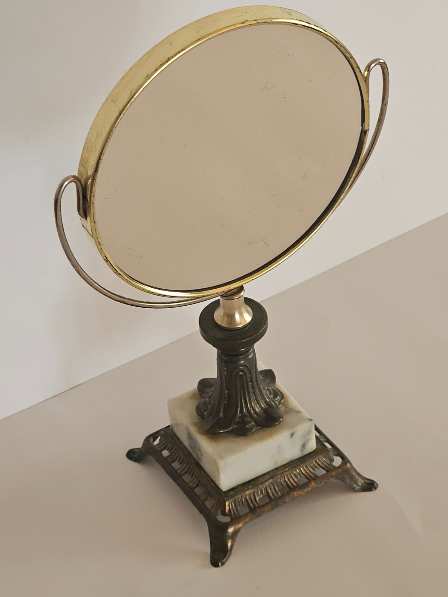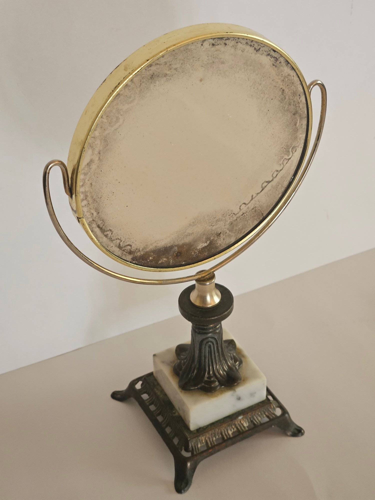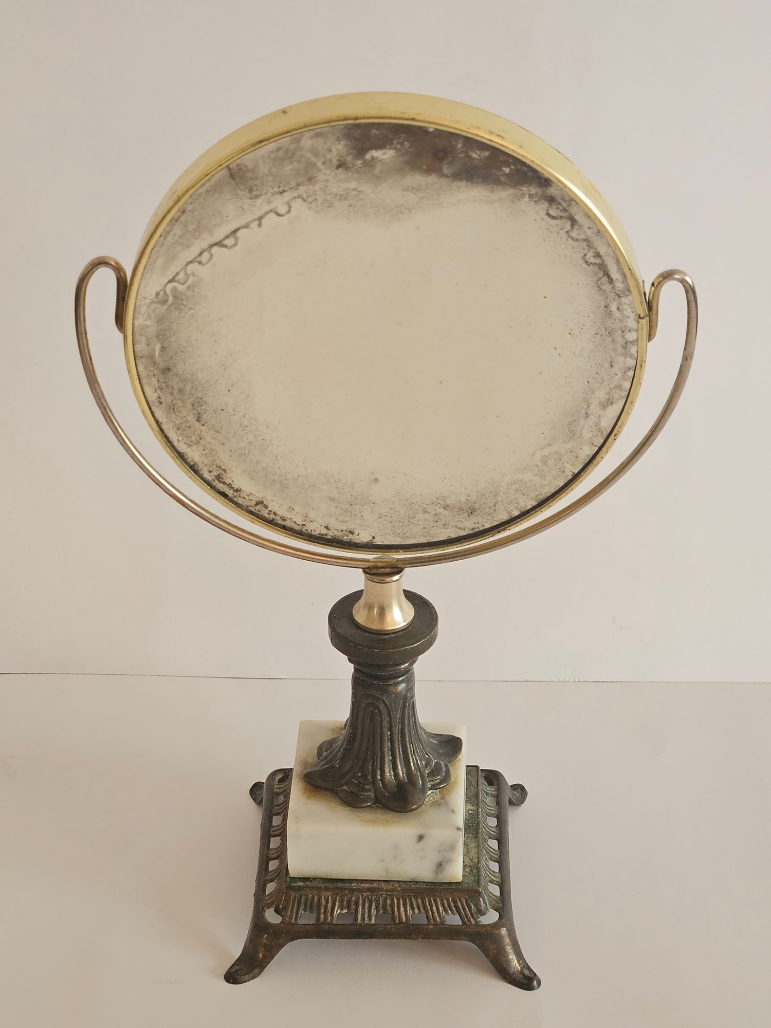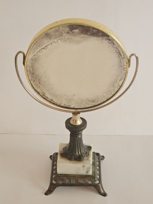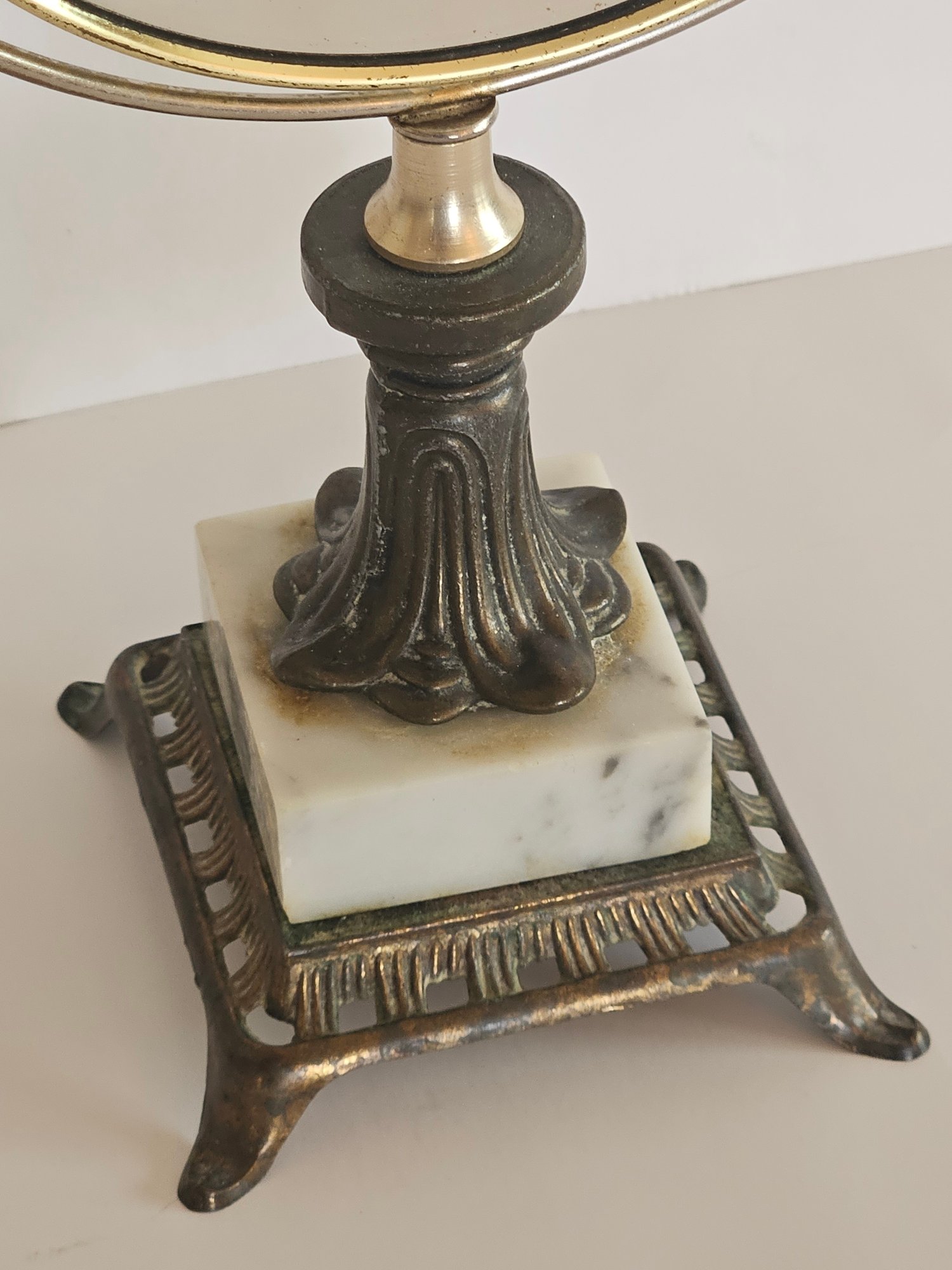 Vintage/Antique Victorian, double-sided, swivel vanity or shaving mirror. It features a round, brass-trimmed mirror that rotates on a cast iron stand, which is accented with a white marble base. The mirror includes a magnified side for close-up viewing. Measures approximately 10.25" tall. Pre-owned condition. Has wear because of age. See pics. One side of the mirror has oxidation.
