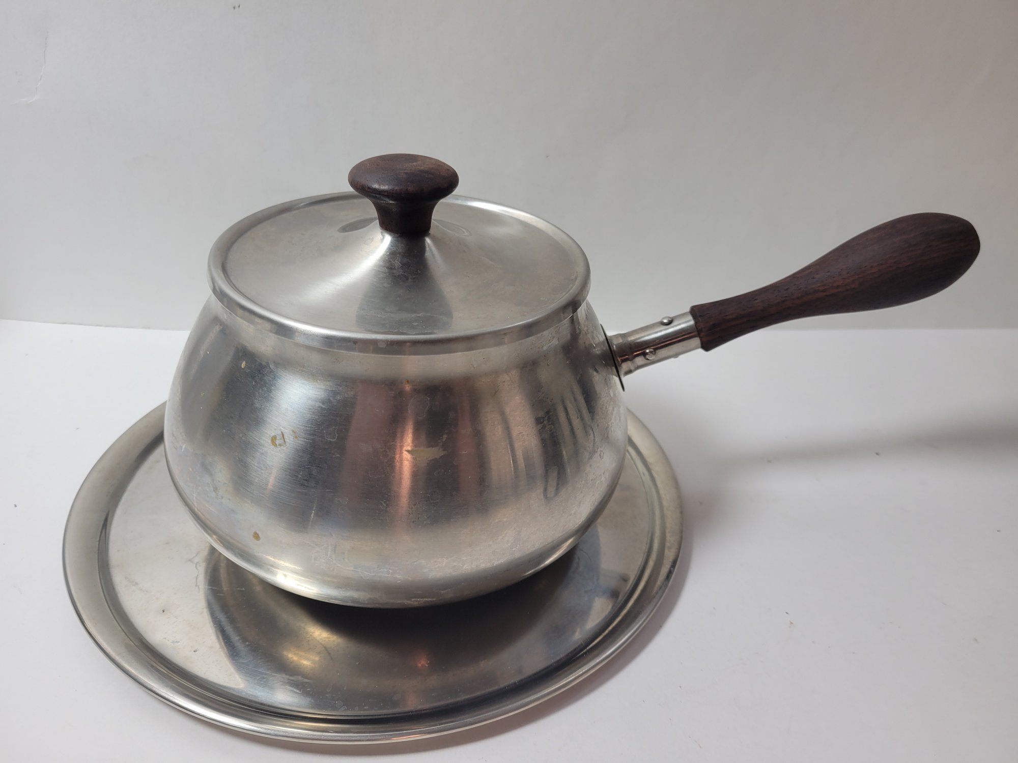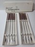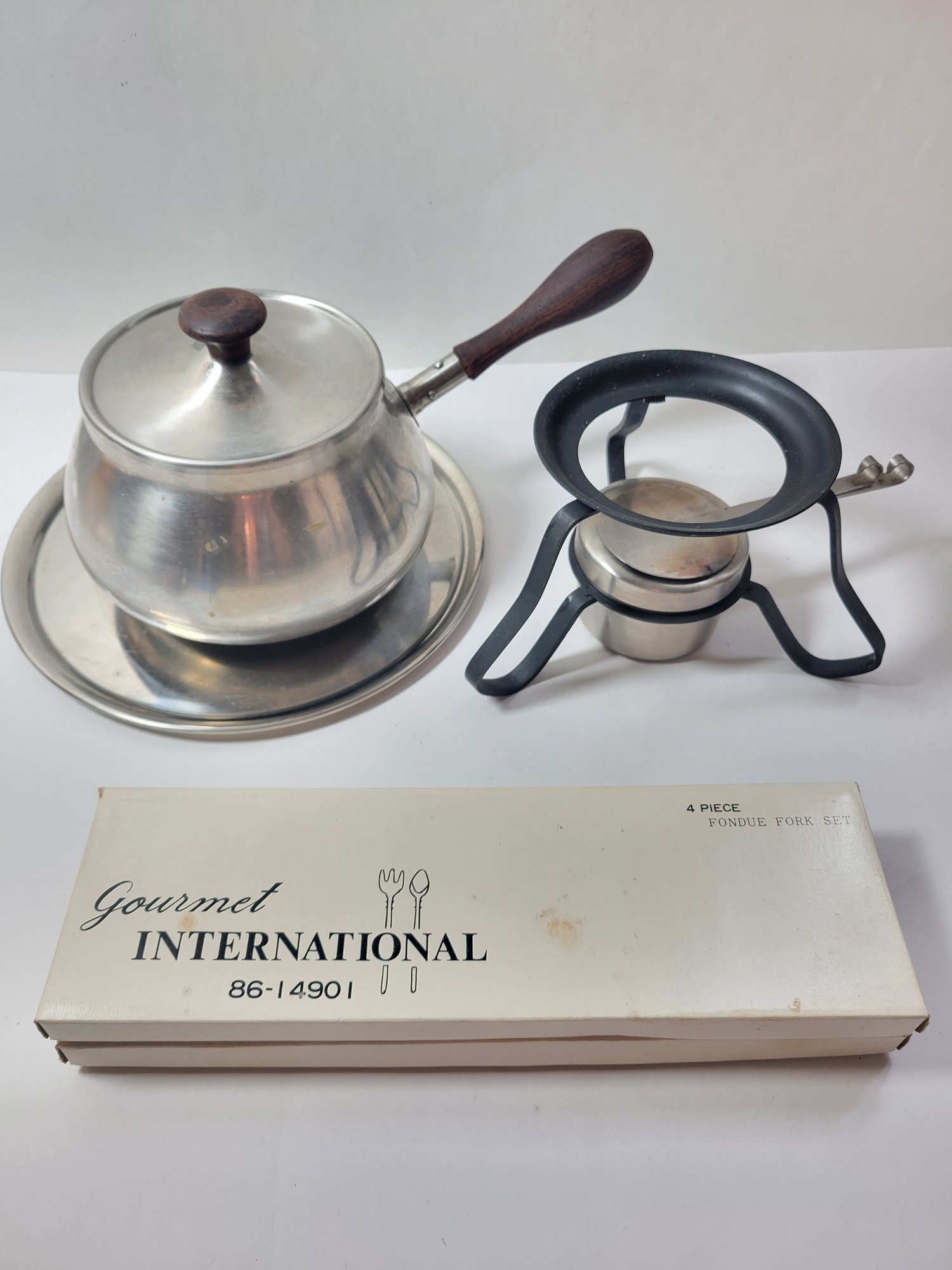 Vtg Gourmet International Fondue Set Japan. Model No. 86 1490 1. Includes an 8 piece fondue fork set. Also included is a pot with lid, stand and burner. Made of Stainless Steel with a wood handle and knob. Pre-owned condition. Comes in original box. Box has wear.