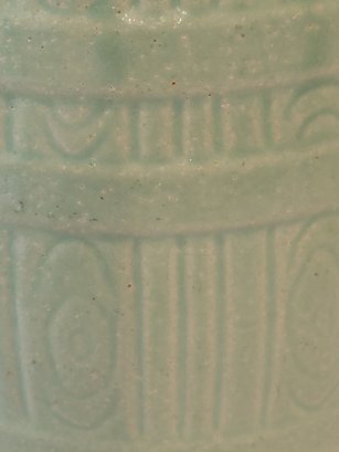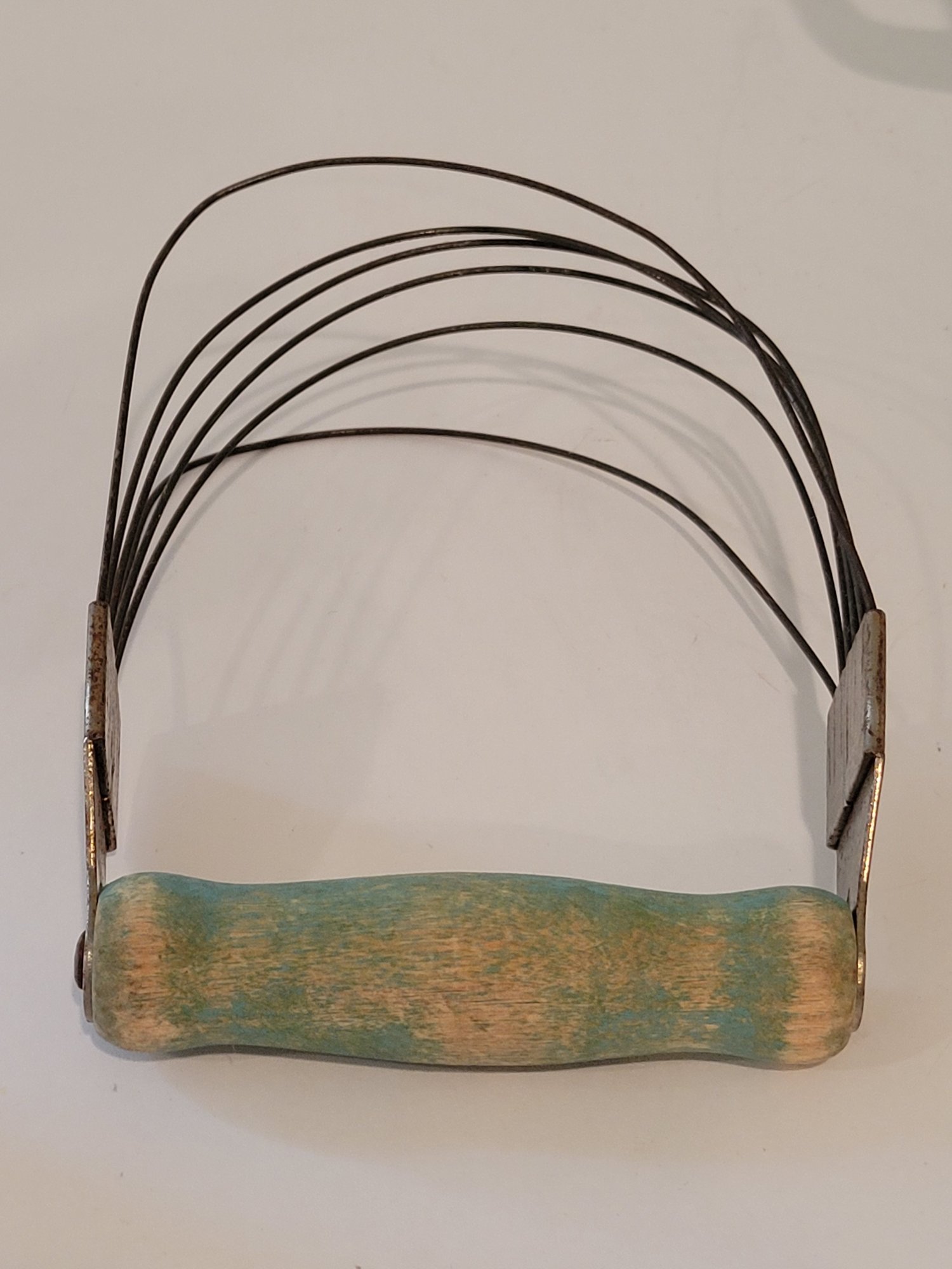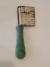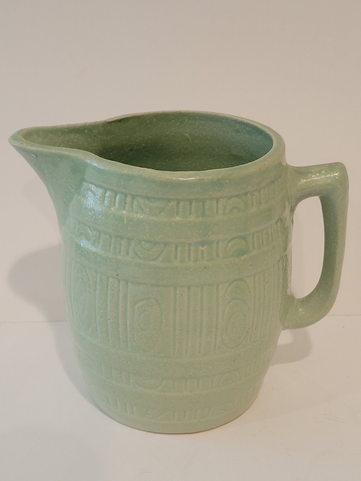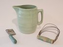 Vtg Green Barrell Stoneware Pitcher And Vtg Cutter Utensils. Includes a Green Barrell Pitcher that measures 6.5". Has a faux wood grain design. Also a 7" green wood handle vegetable crinkle cutter and a 5"green wood handle dough cutter. Pre-owned condition. Have wear.