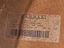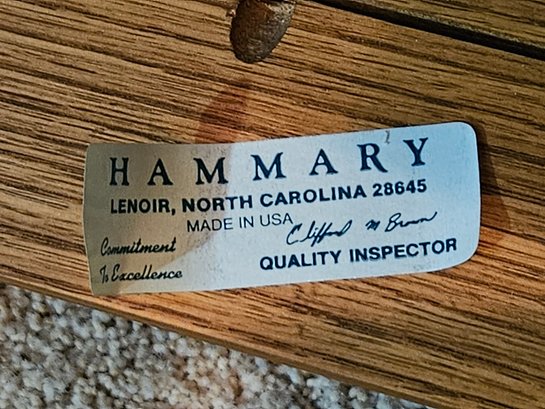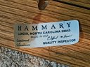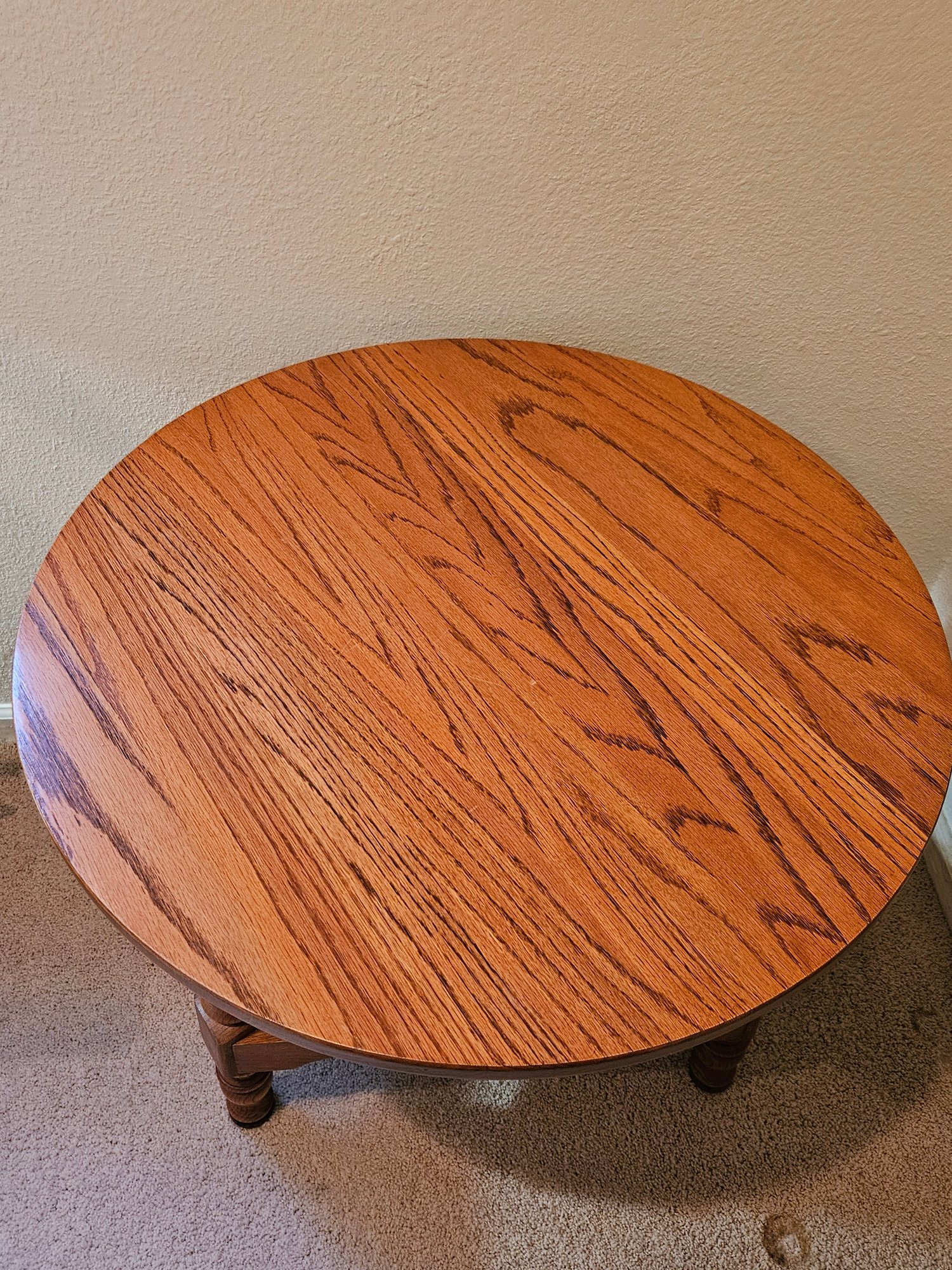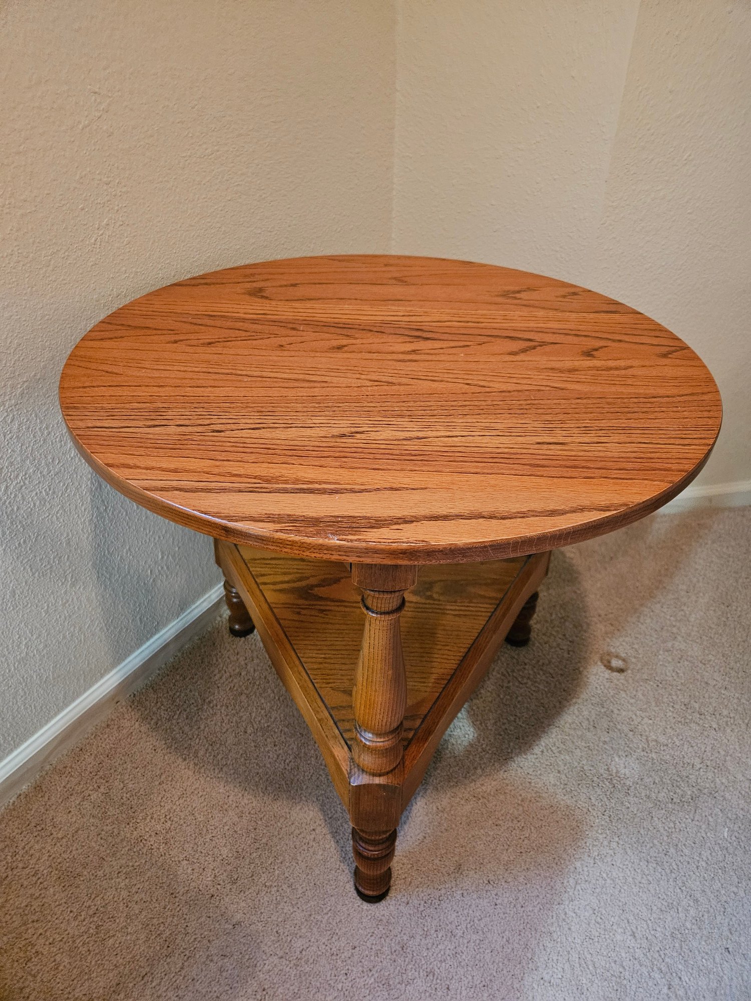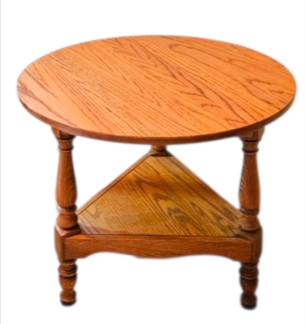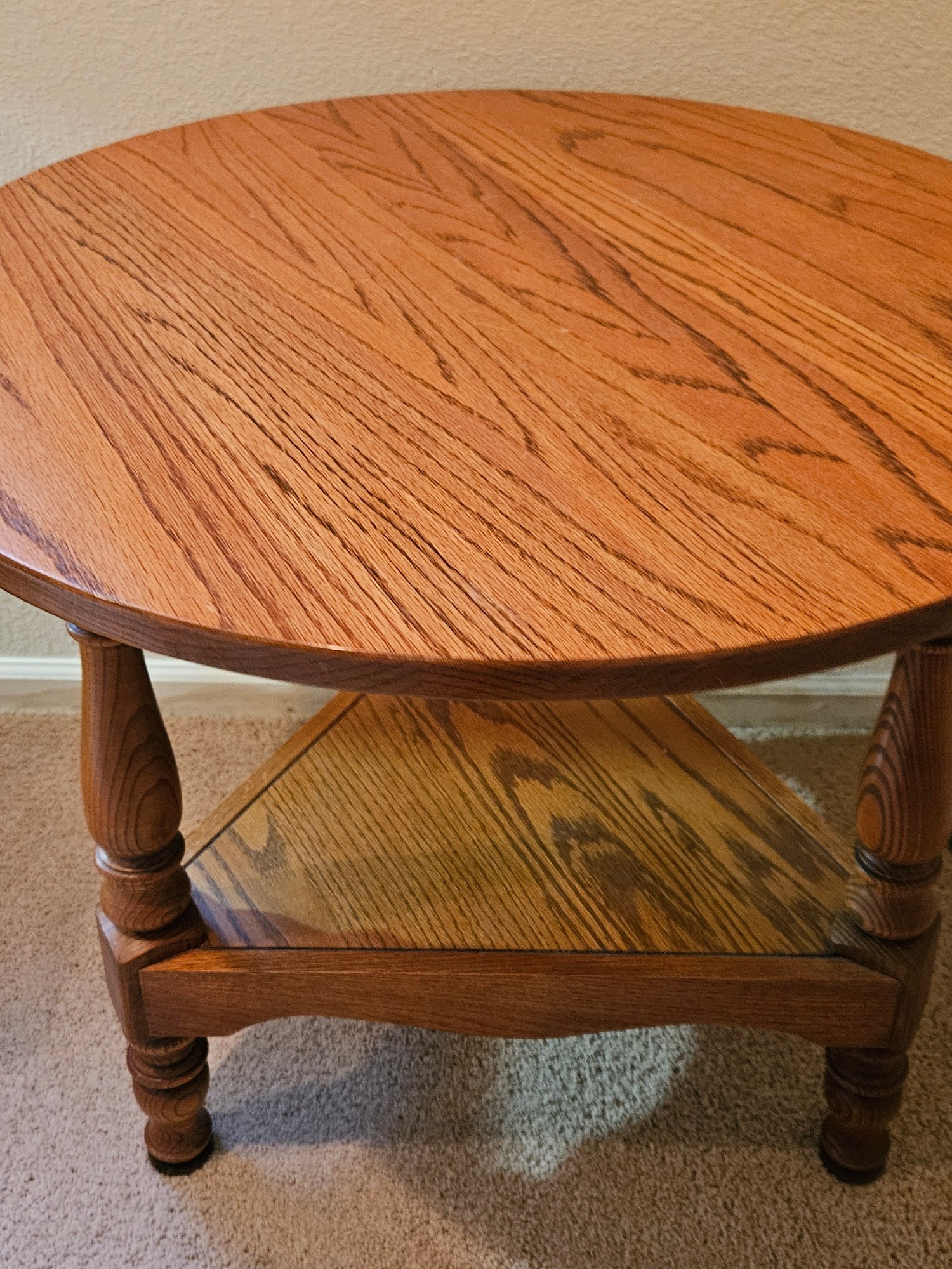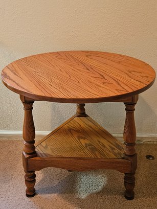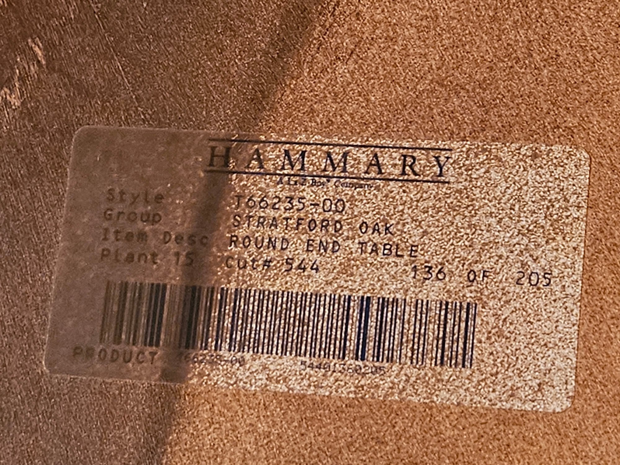 This is a vintage Hammary brand two-tier Stratford oak wood round side/end table featuring turned legs and a triangular lower shelf. Measures approximately 26"round x 24"h. Pre-owned condition.