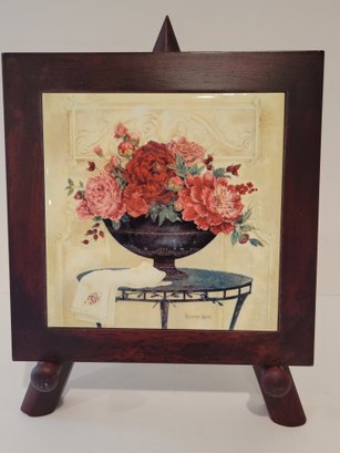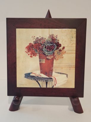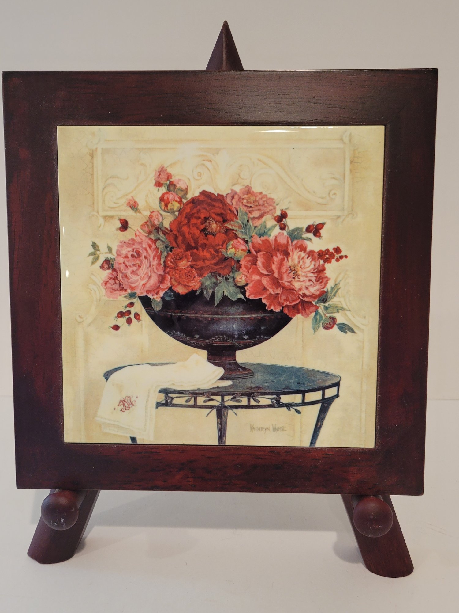 2 Vtg Karen White Wooden Framed Wall Tile On An Easel. Measures approximately 8" x 8". Can also be hung on the wall. Pre-owned condition.