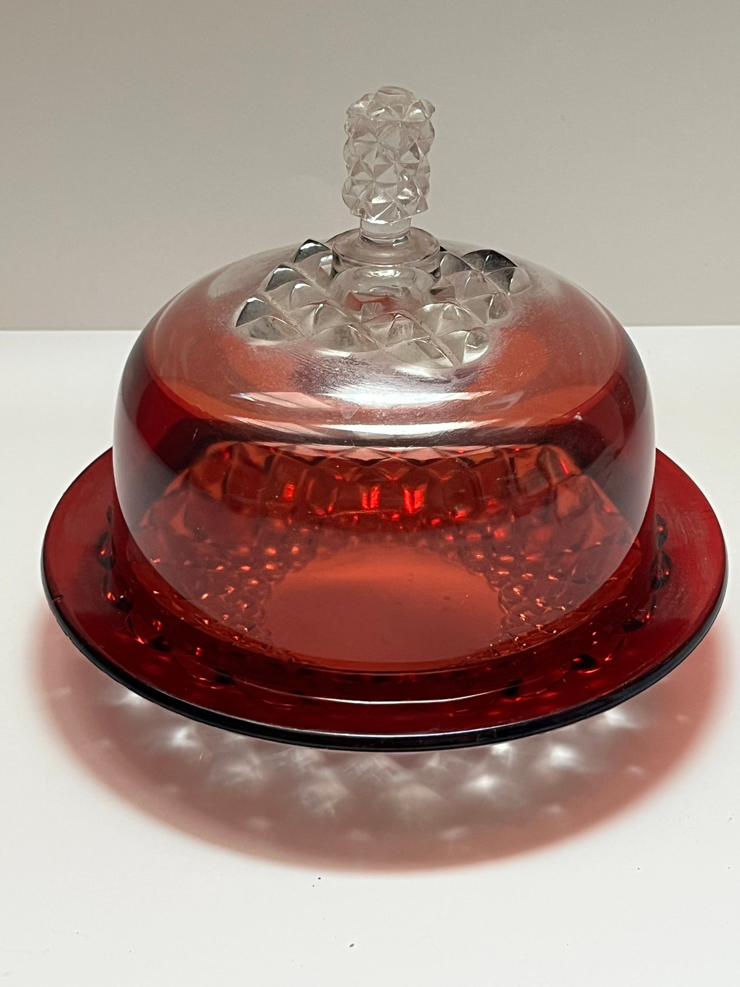 Vtg Red Crystal Candy Dish, comes with a red rim 7” deep plate for the bottom piece and the top with a red dome and a long clear handle. Measures approximately 6” in height. Pre owned condition.