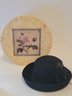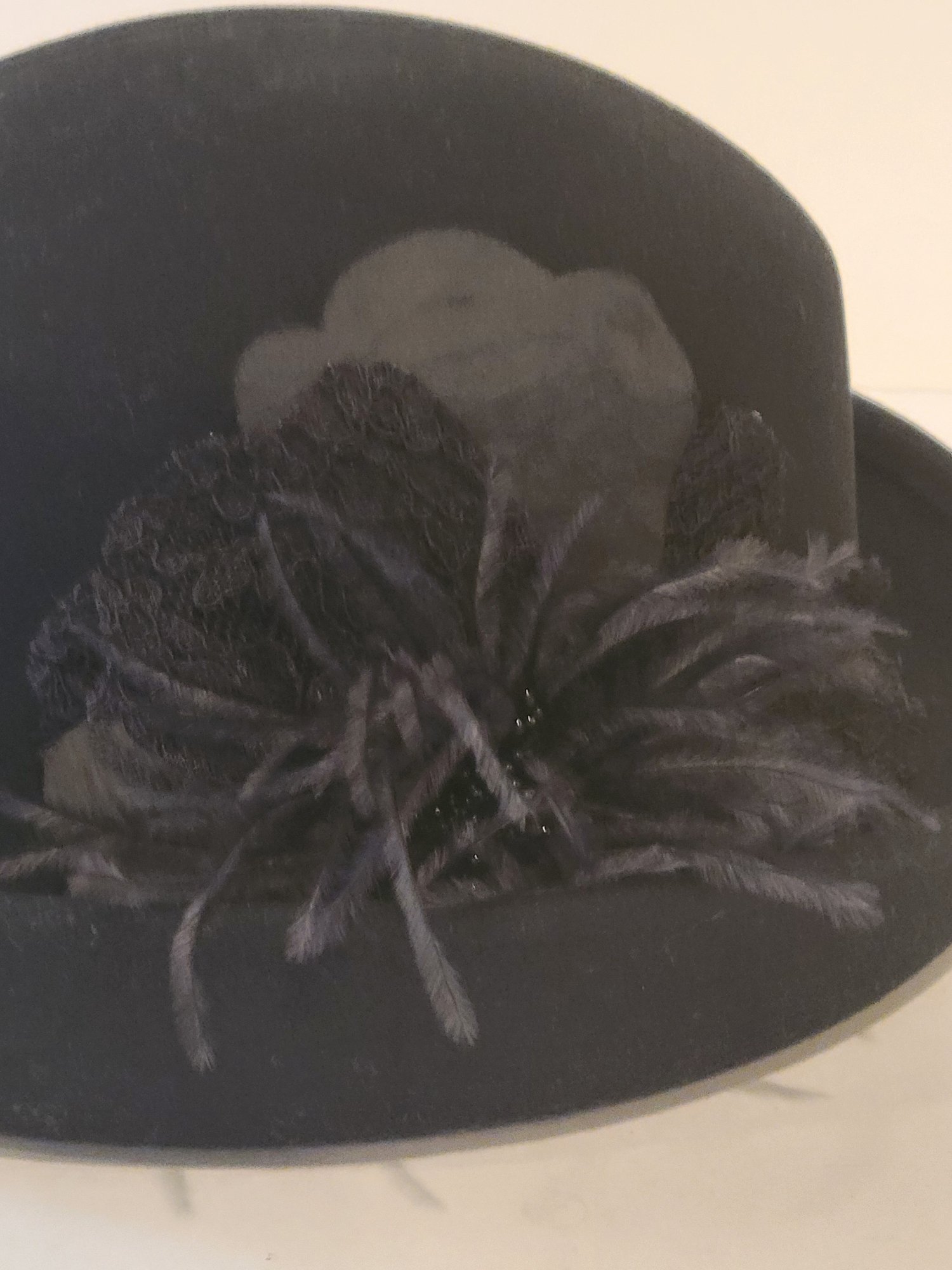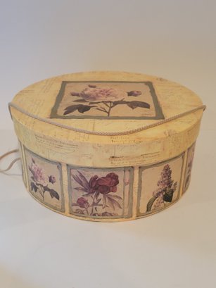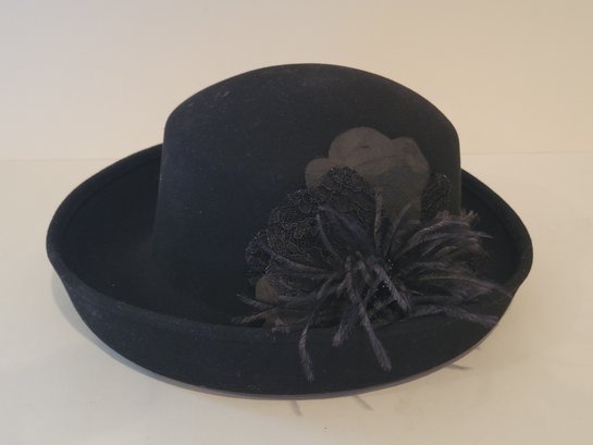 Vtg Style Floral Hat Box and 100% Wool Black Hat. Hat box measures 14" round x7". Also a Charter Club 100% Black Wool Hat with a feather flower. Hat measures 12" across. Pre-owned condition.