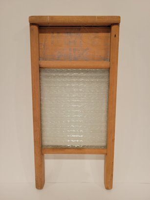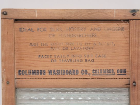 Vtg Wood And Glass Washboard by Columbus Washboard Co. Measures approximately 8.5" x 18". It is Ideal For Silks, Hosiery and Handkerchiefs. Packs Easily Into Suitcase or Traveling Bag. These statements are printed on the wood. Pre-owned condition.
