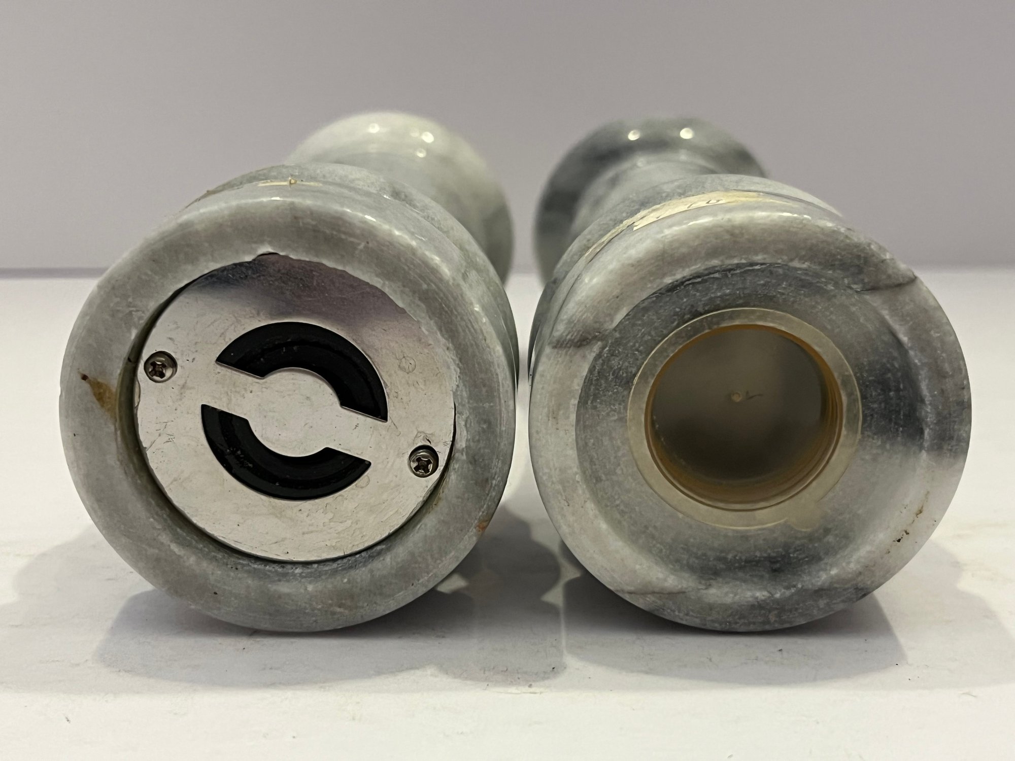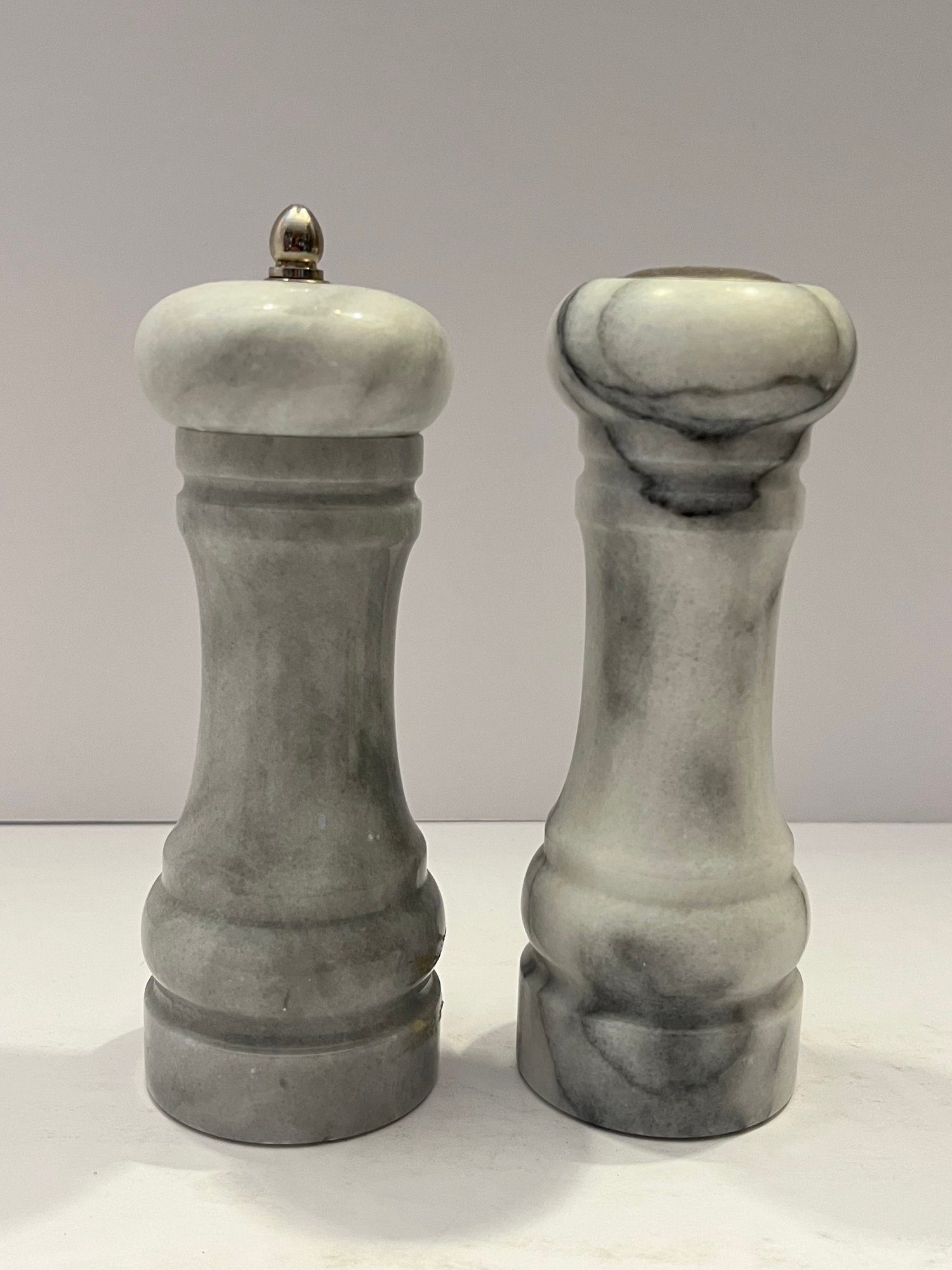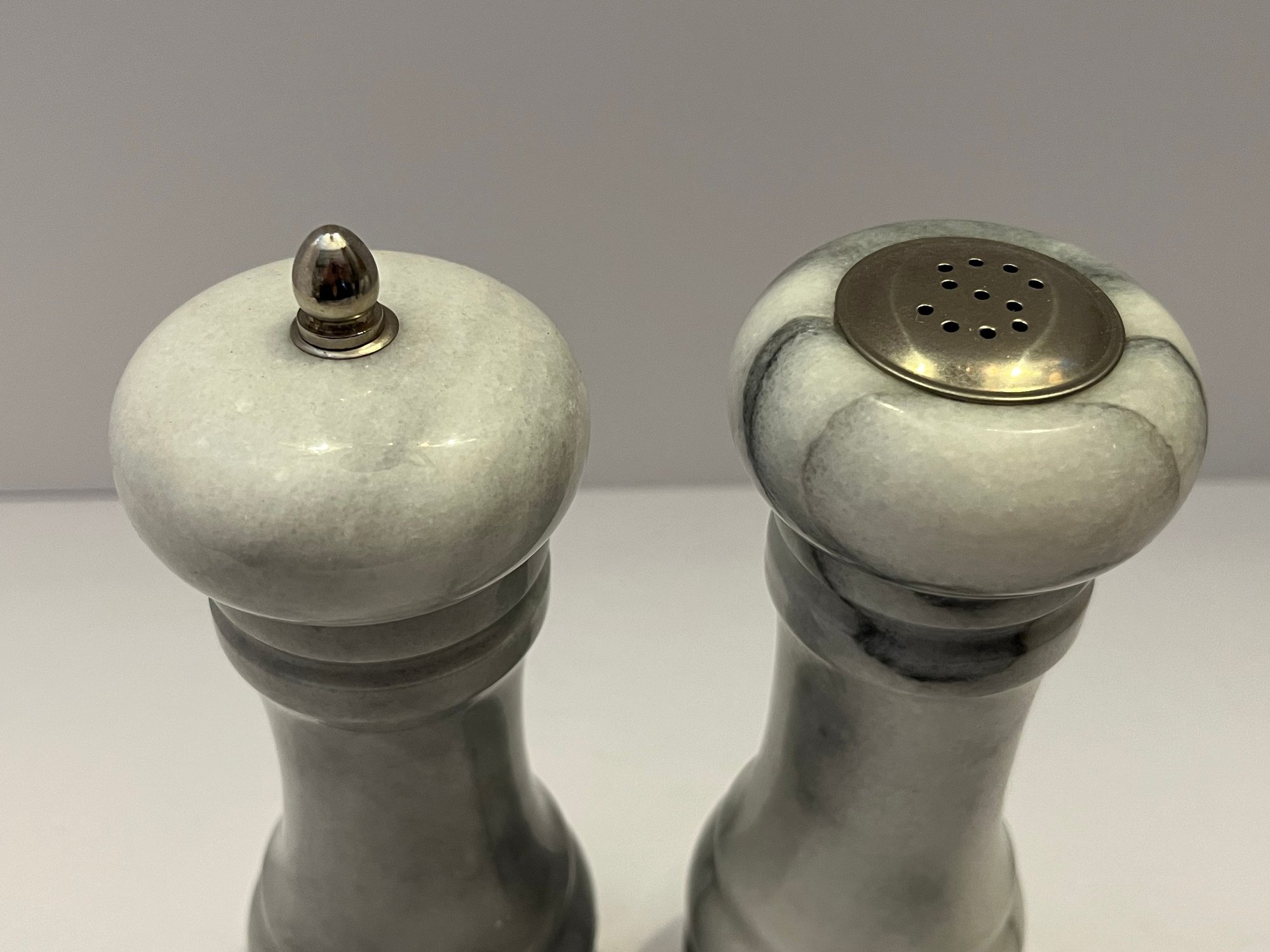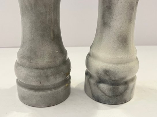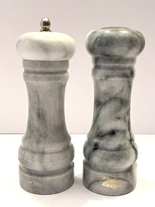 White And Grey Marble Salt And Pepper Grinder Set. Pepper grinder loads in at the top and the salt shaker loads from the bottom. Measure approximately 6.5” in height. Pre owned condition.