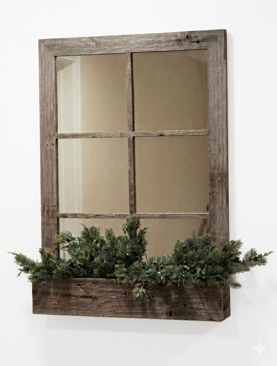 Window Pane Mirror With Planter. Ash toned wood frame with planter. Measures approximately 29"L x 4"W x 40.5"H. Pre-owned condition. May have wear.