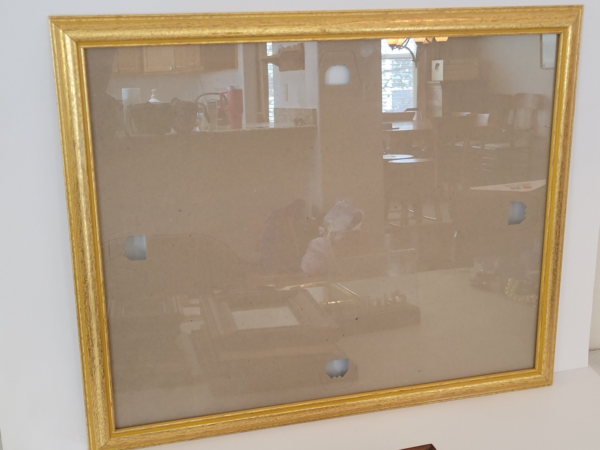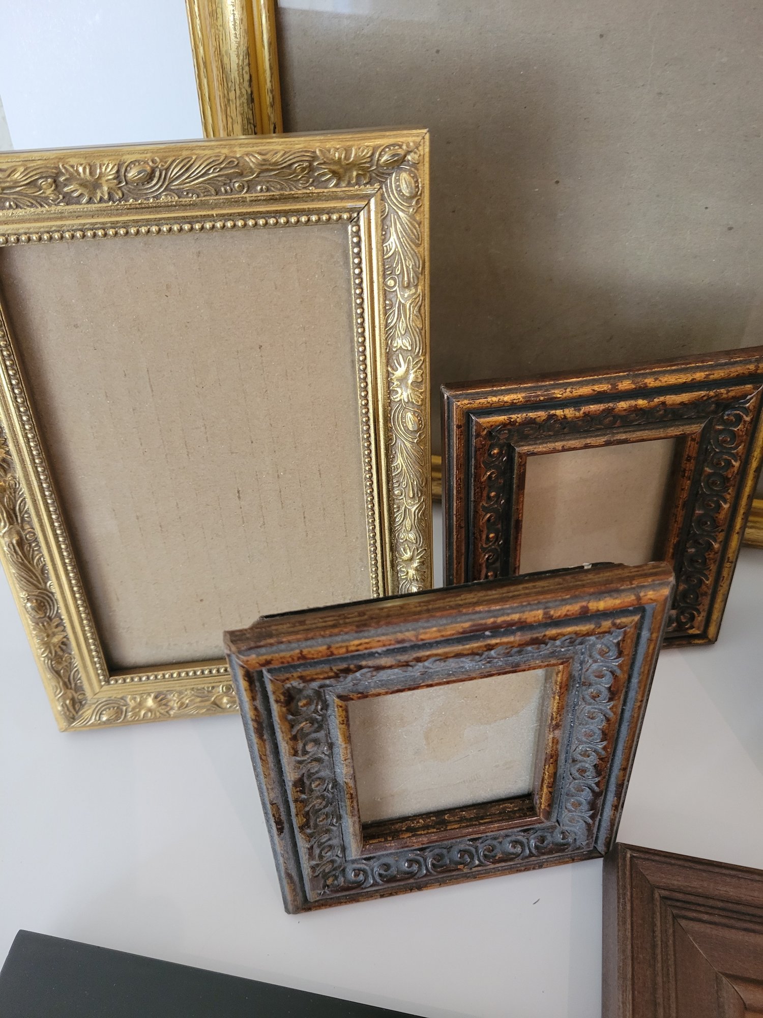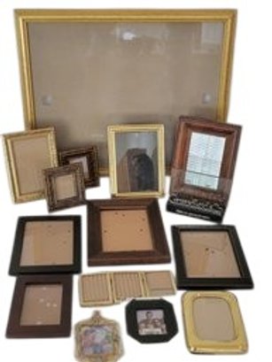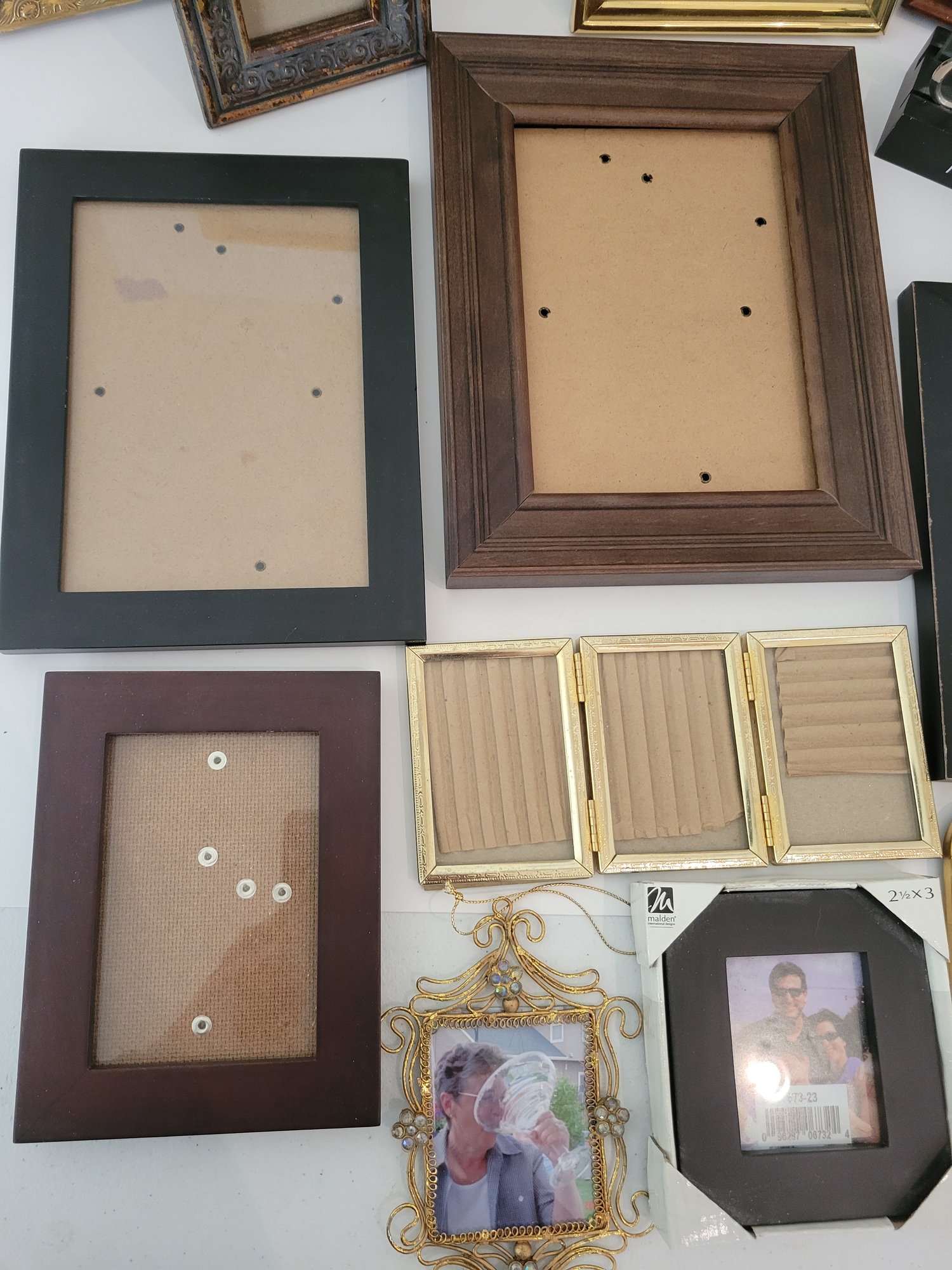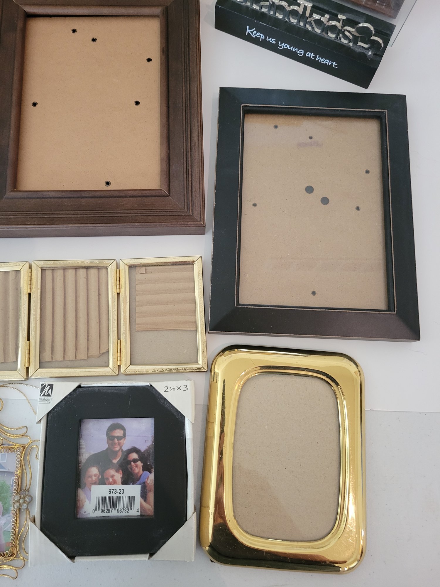 Wood and Metal Assorted Picture Frame Lot X 15. Includes a gold frame 22" x 18" to a 3" x 4" frame and varying sizes. There is gold, wood, black and a Grandkids frame. Pre-owned condition.