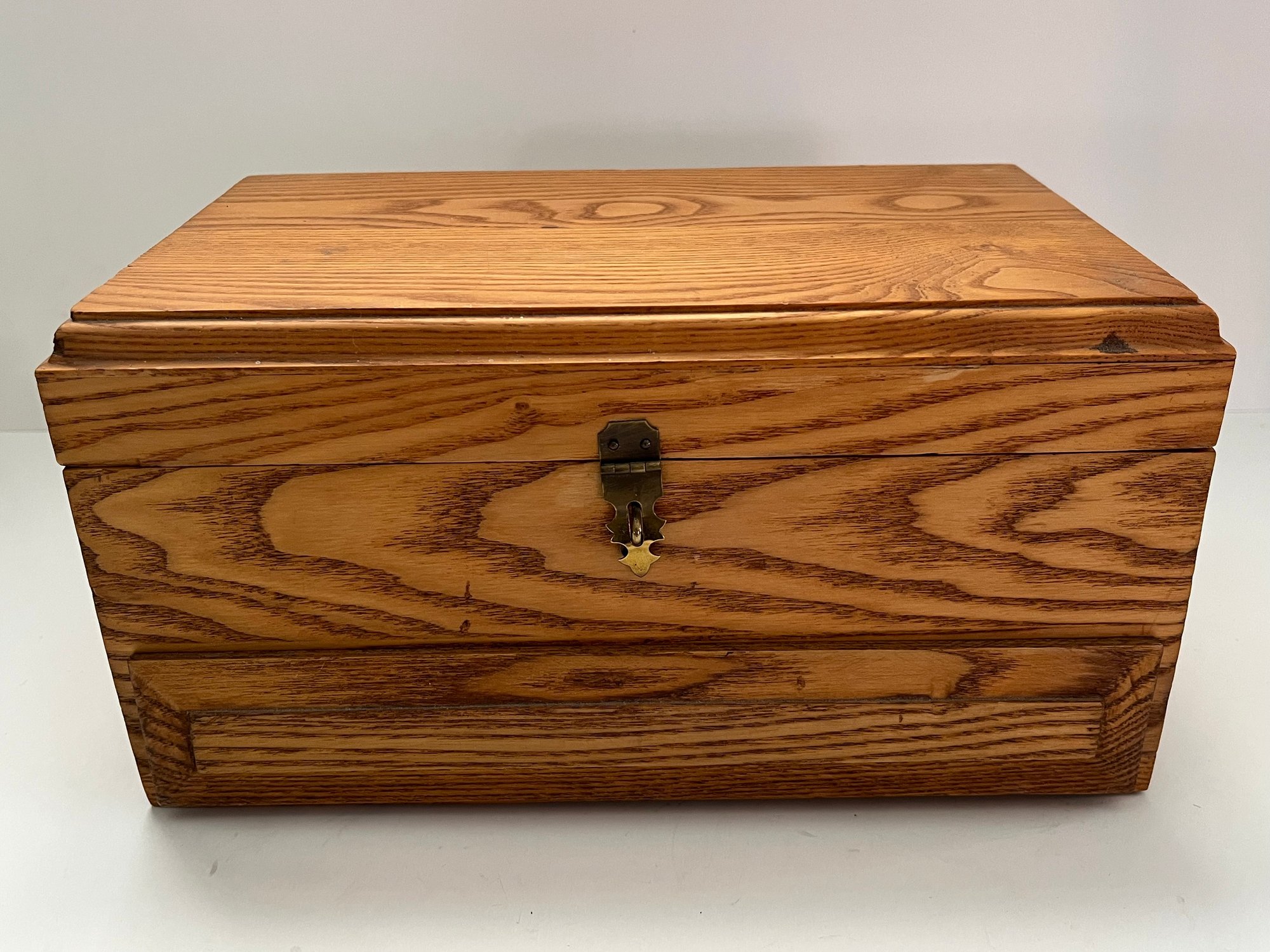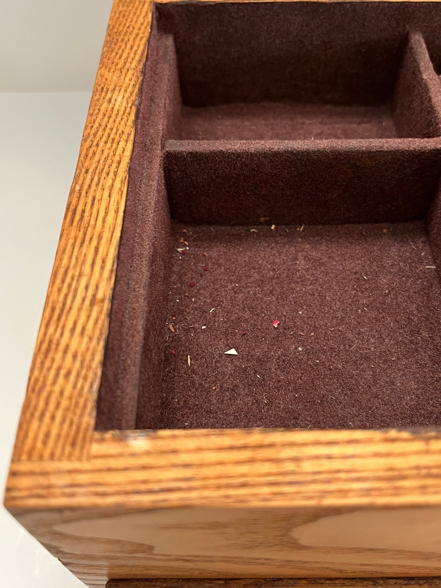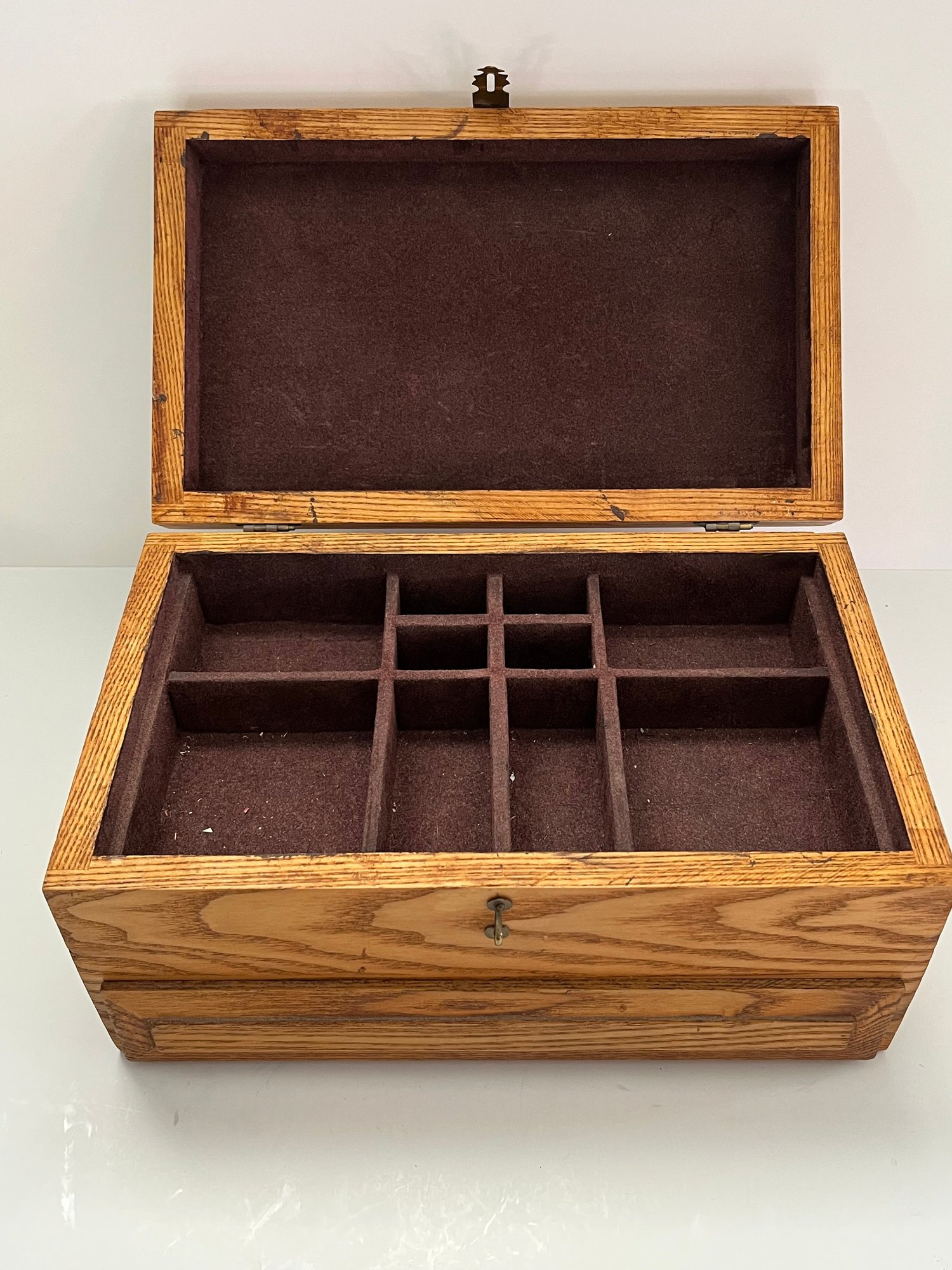 Wooden Sectioned Jewelry Box featuring a pull out drawer with different sizes dividers and an open top with the same. Has a brown velvet on the inside and a grainy light wood finish on the outside. Measures approximately 6”H x 12”L x 8”D. Pre owned condition.