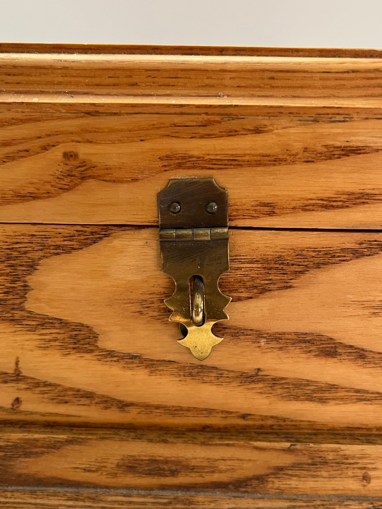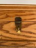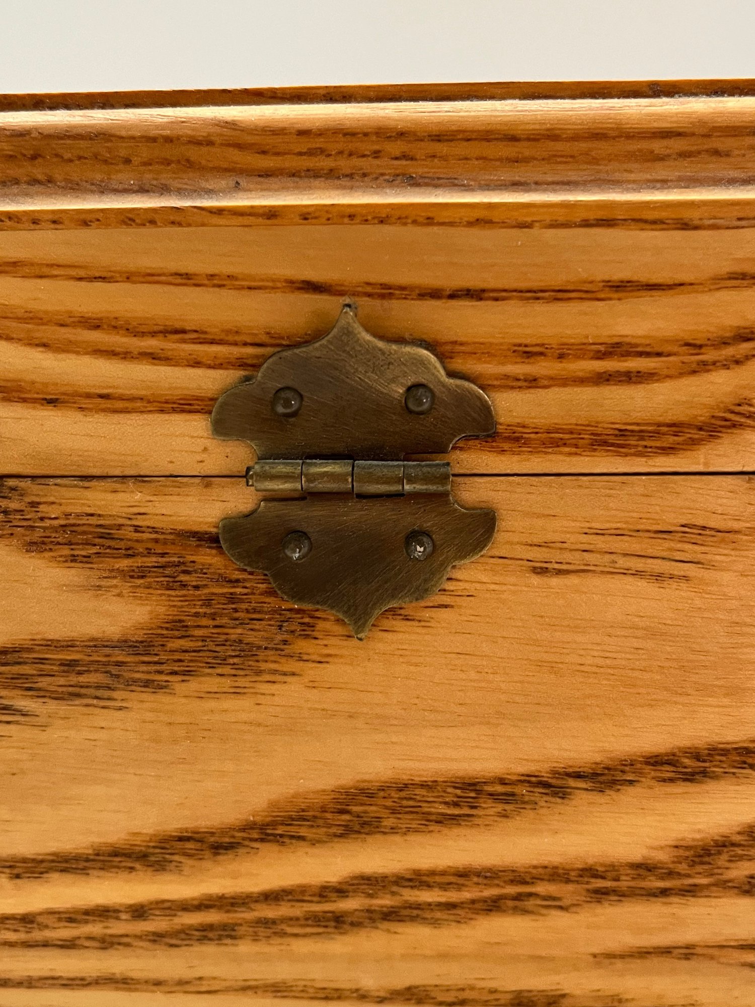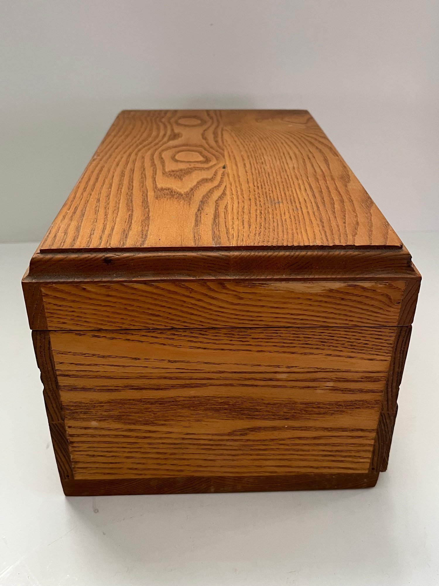 Wooden Sectioned Jewelry Box featuring a pull out drawer with different sizes dividers and an open top with the same. Has a brown velvet on the inside and a grainy light wood finish on the outside. Measures approximately 6”H x 12”L x 8”D. Pre owned condition.