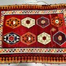 Geometric designs on a maroon field.