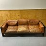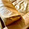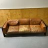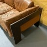 Well worn hardwood frame with comfy leather cushions! Wear to leather cushions from use as well as flap stitches that have come a part at seams on some cushions.
