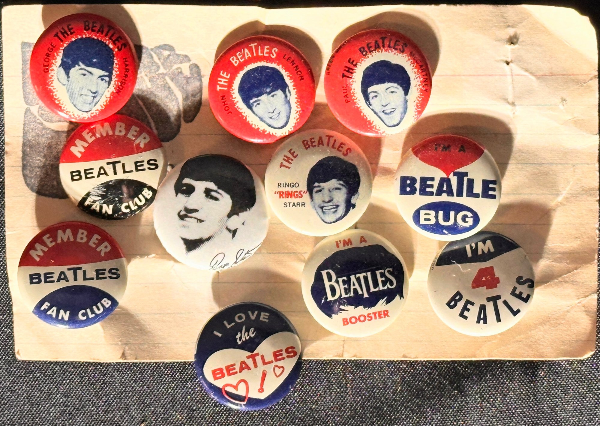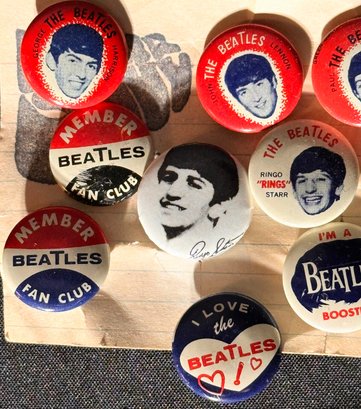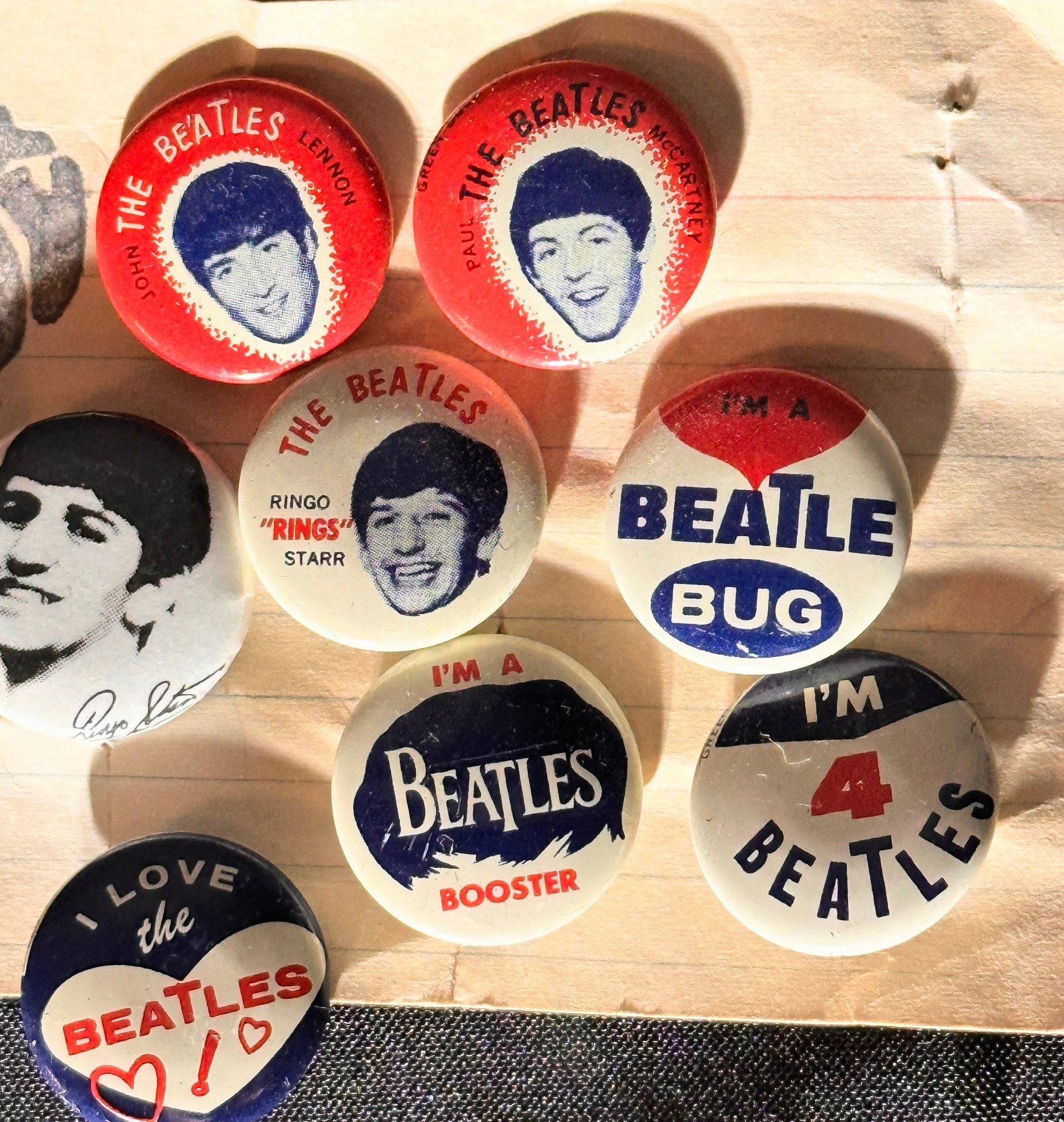Includes 11 Vintage Beatle Pinback Buttons as pictured measuring approximately 1-inch in size and 1.5” - 2.5” in size, items are as pictured.