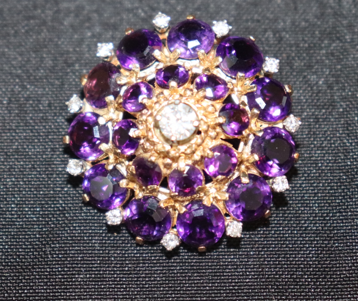 Contains larger center diamond, 11 smaller diamond accents surrounded by 11 larger amethyst stones & 8 smaller amethyst stones. Measures approx. 1.25" diameter. Weighs approx. 8.4 DWT TW.