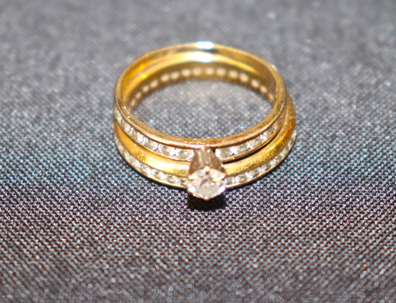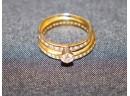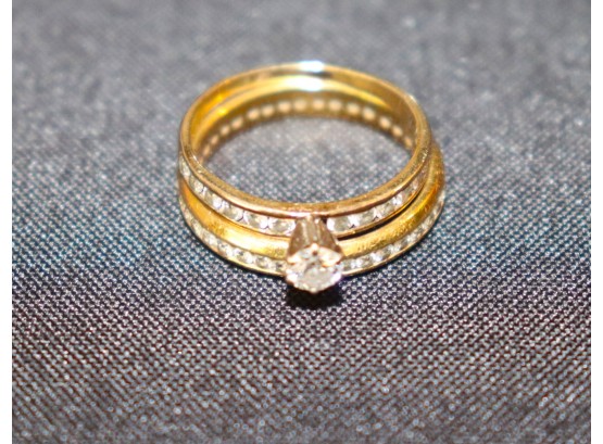 Diamond engagement ring is approx. size 7.25. The diamond wedding band is approx. size 8. Combined weight is approx. 3.2 DWT TW.