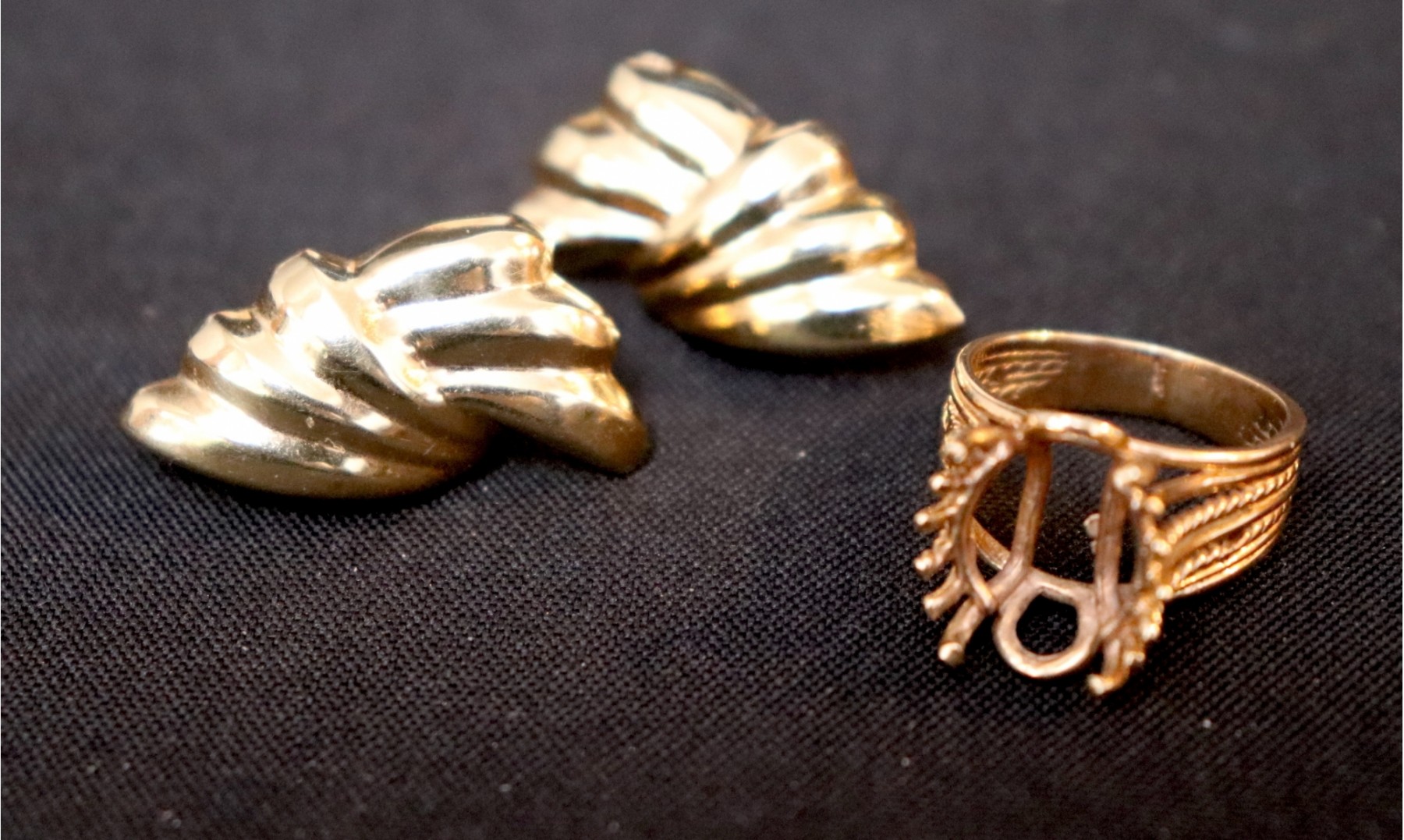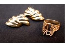 Earrings measure 1.25"L x .625"W. They have post and clip backs. Weigh approx. 3.5 DWT. Ring is approx. size 7 and weighs 3.7 DWT. Combined weight is approx. 7.2 DWT