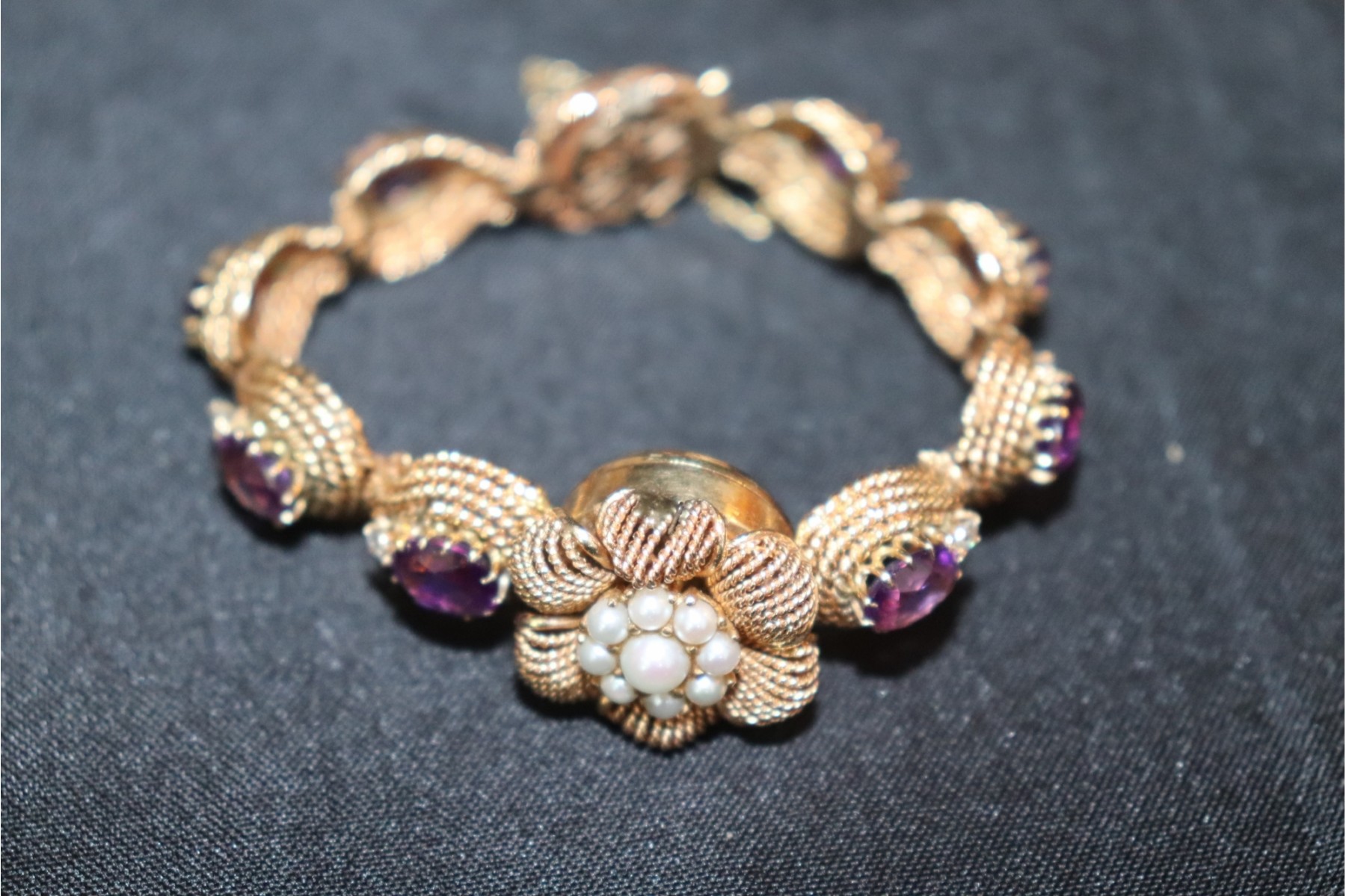 Contains 9 large amethysts and 8 accent diamonds. Watch is manual wind, currently in working condition. Approx size 6. Weighs approx. 27.8 DWT TW.