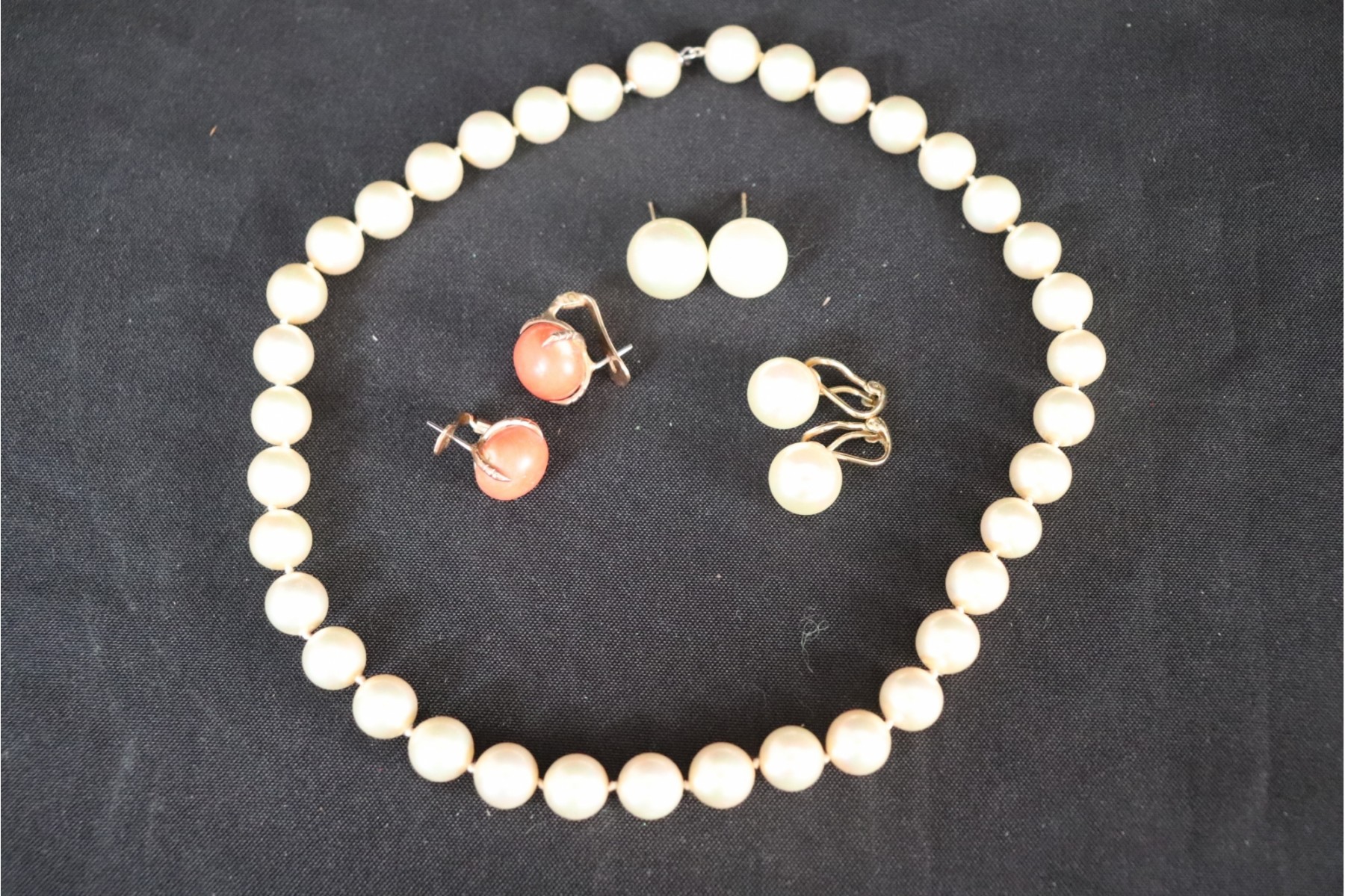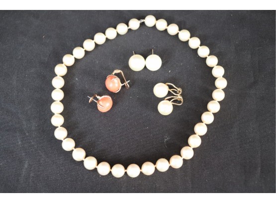 Jewelry lot has a faux pearl necklace 16” L, (3 assorted pairs of earrings) 2 faux pearl earrings, and coral earrings that are .5” L have 14K YG posts and clip backs.