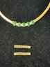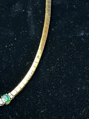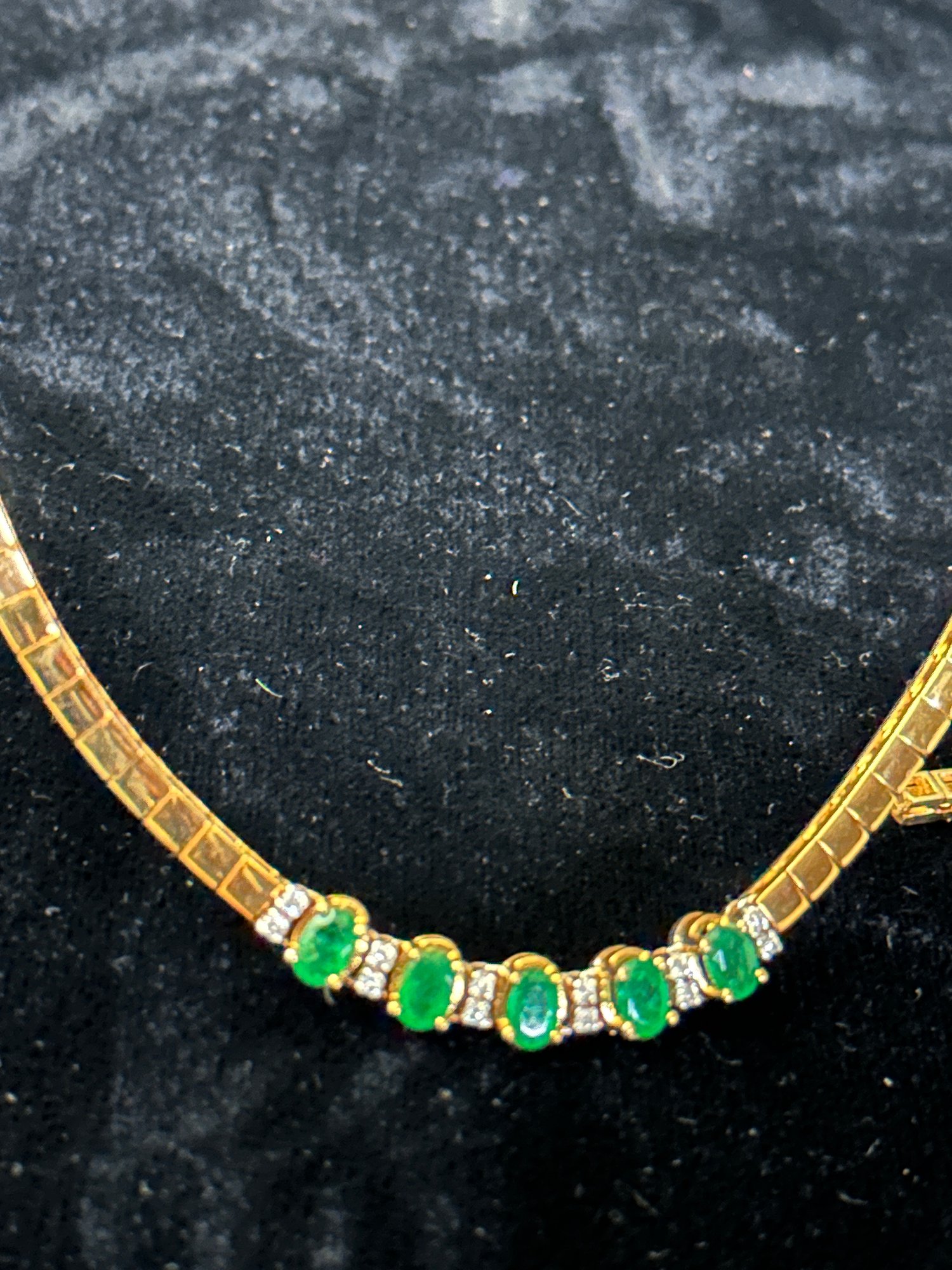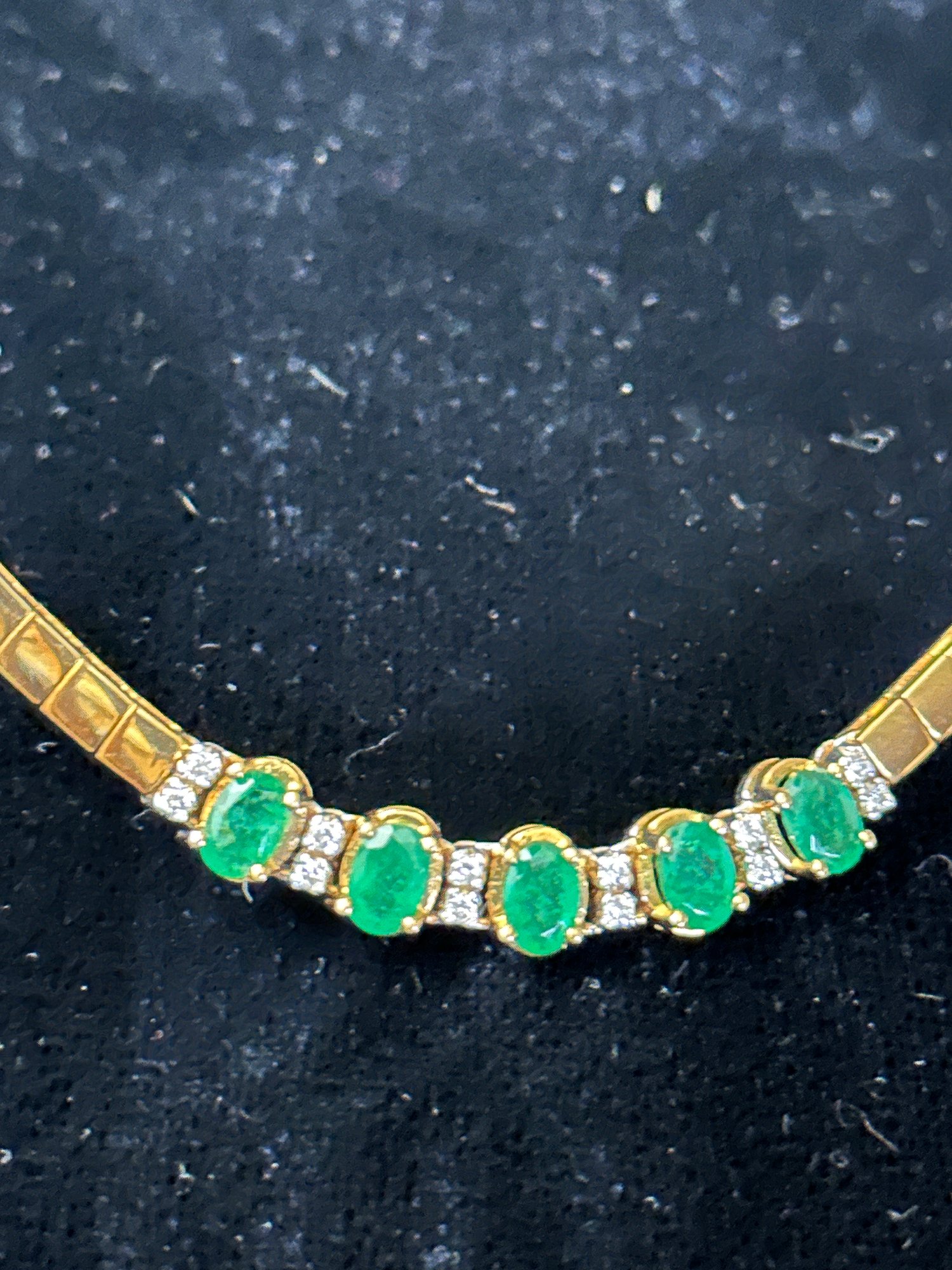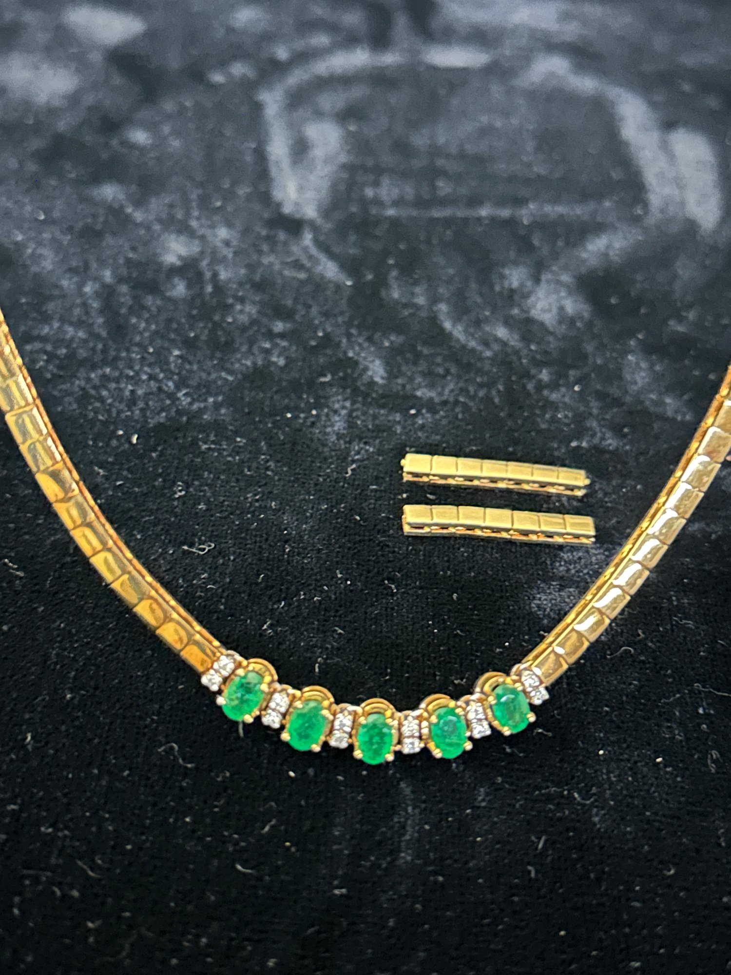 -Contains 5 large emeralds with 6 pair of diamond spacer stones.