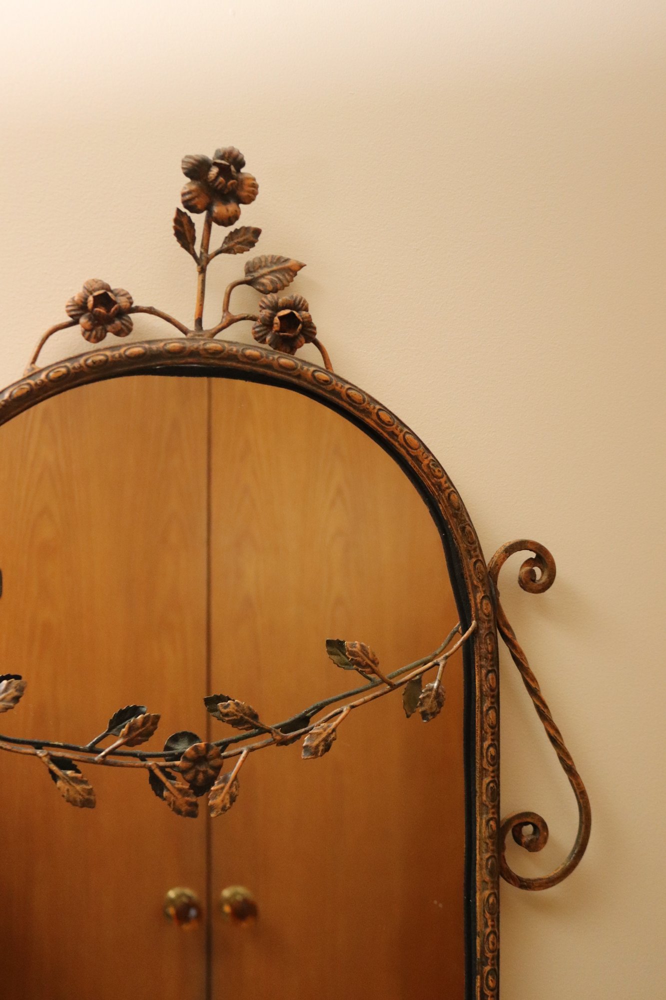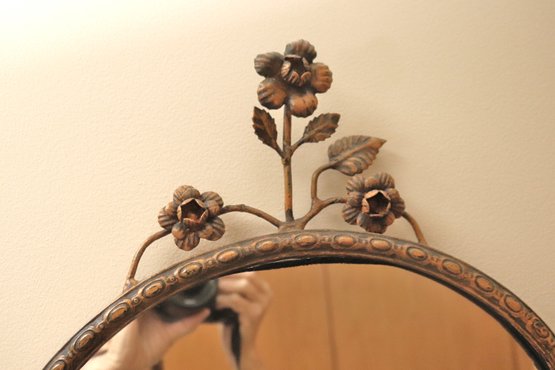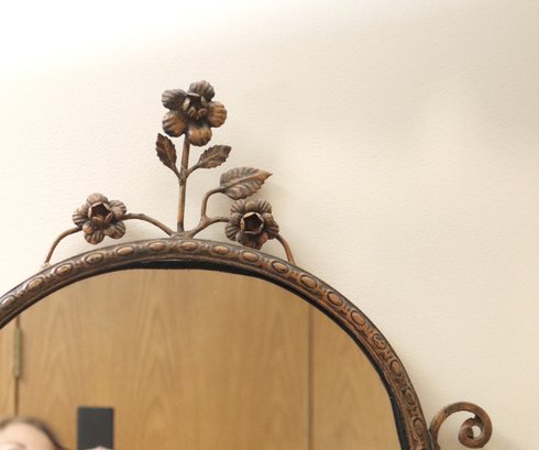 1930’s metal framed mirror with flower and vines, measuring approx. 24” x
