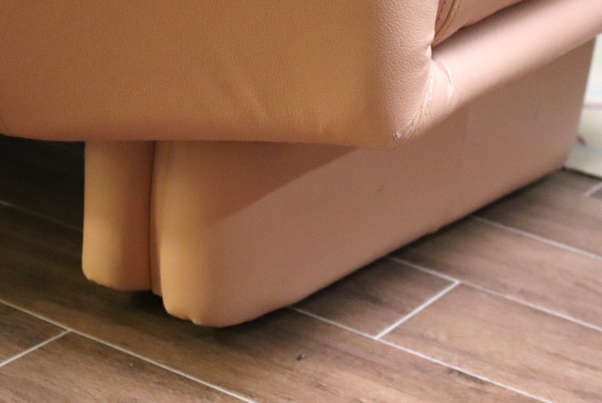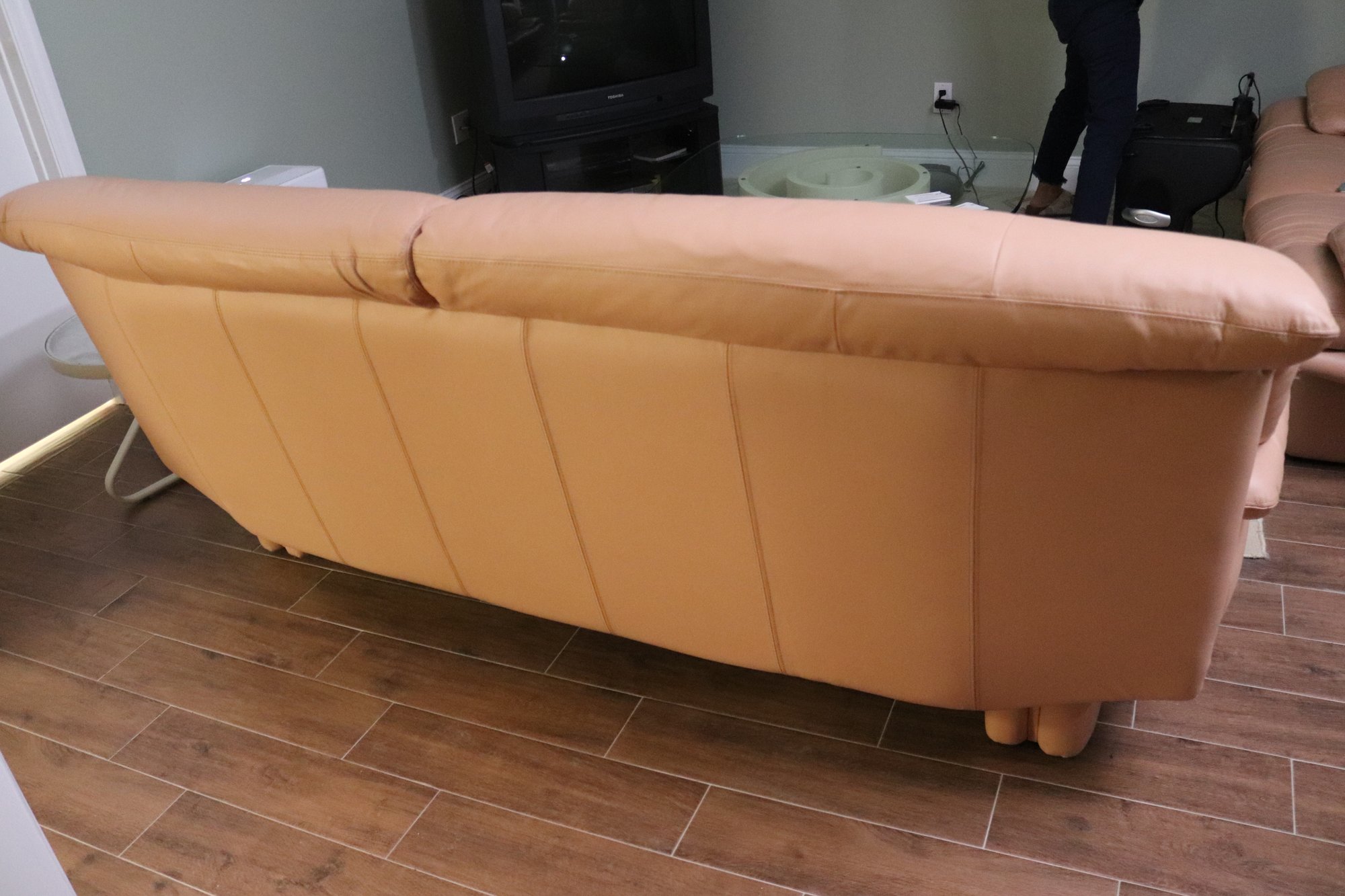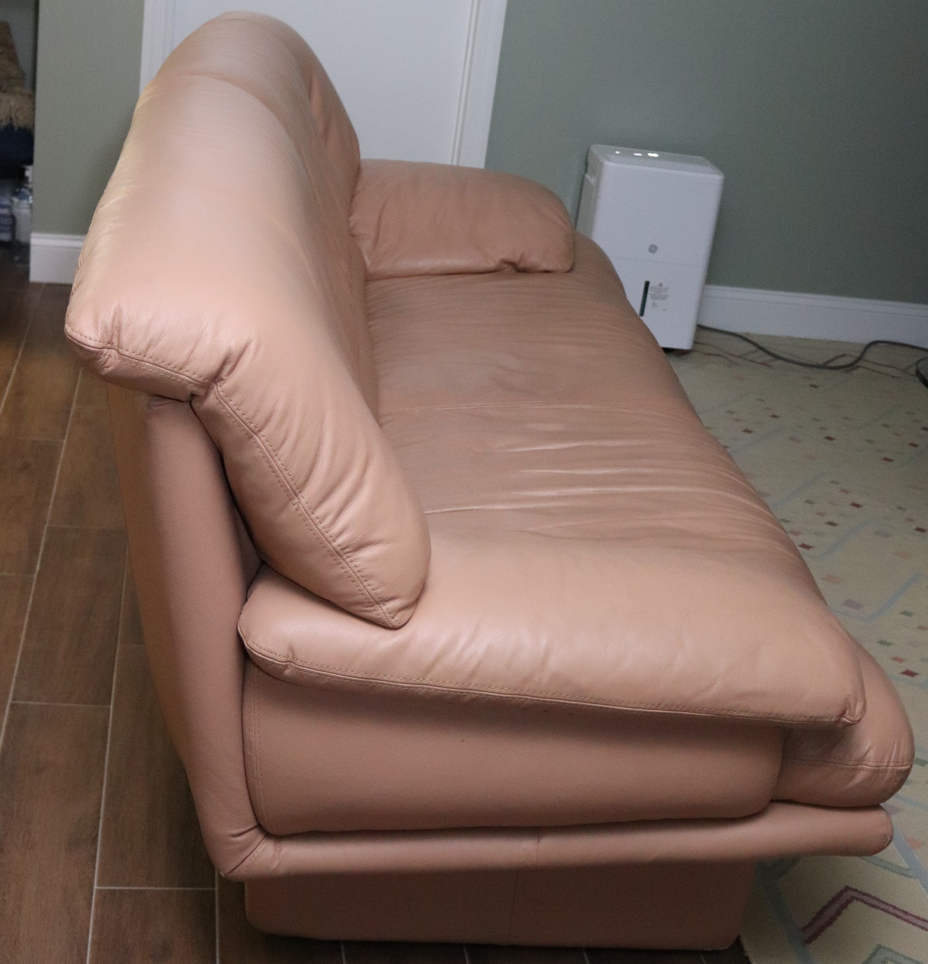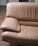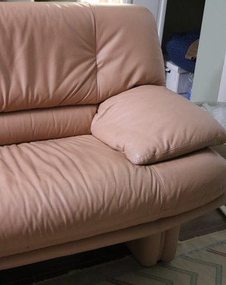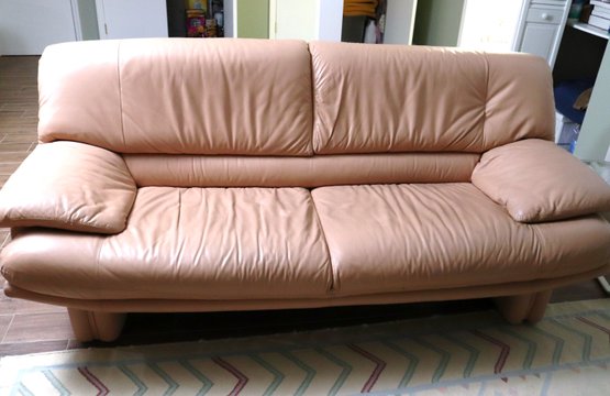 1980’s era modern retro leather sofa in light peach color, with leather wrapped legs. Double stitched seams - a sign of quality! In Great Condition for its age with only one minor scuff area on edge. Please see photos for more details. Could