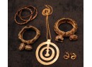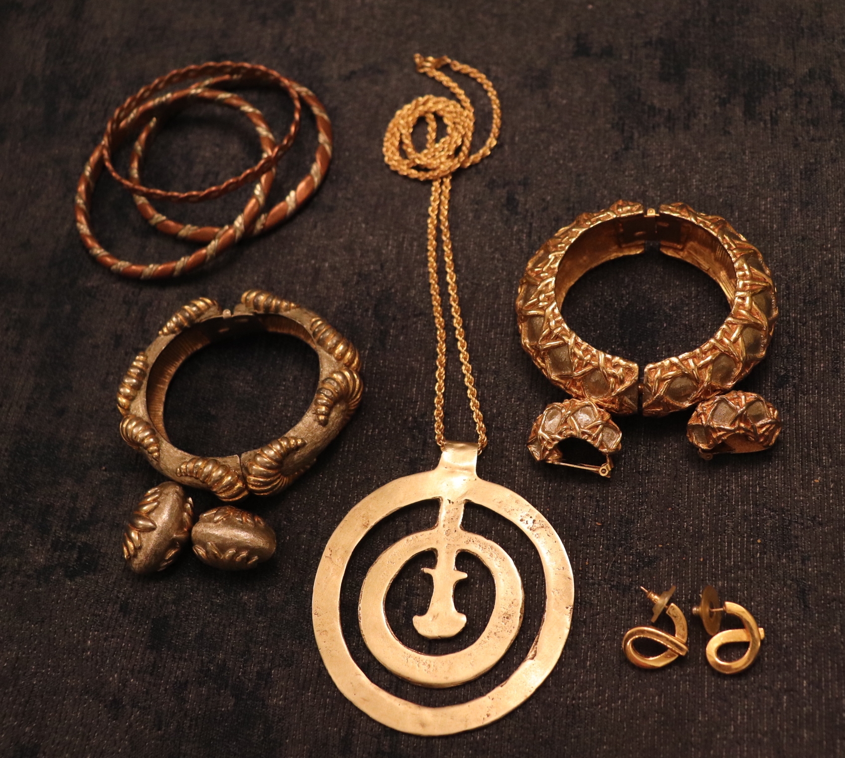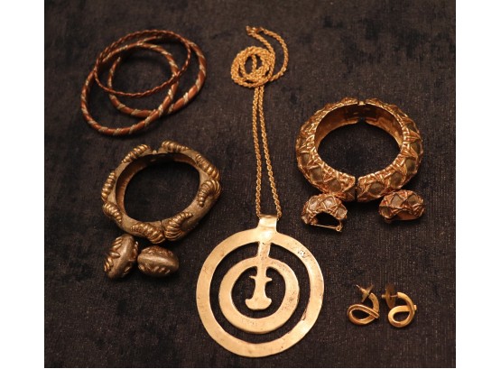Vintage jewelry assortment including2 sets by Kenneth Jay Lane. 3 Copper Bangles Bracelets that are 2.25” interior, clip earrings 1”, Pendant necklace is 16.5” L