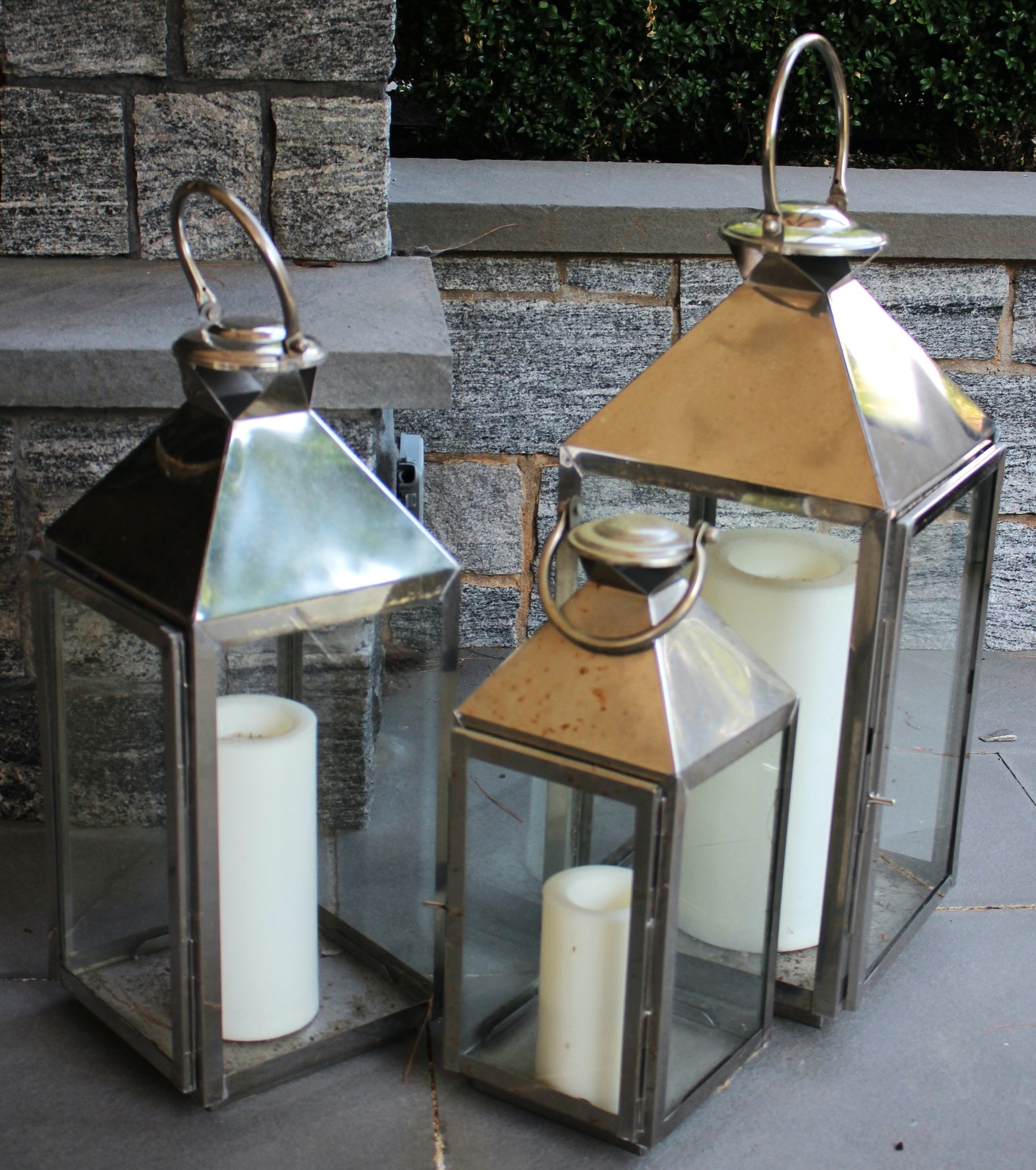 3 Outdoor Lanterns The Larger Lantern Measures Approximately 10” W X 10” D X 24” Tall. Shows Some Age-Appropriate Rust As Wear From Outdoor Use As Pictured!