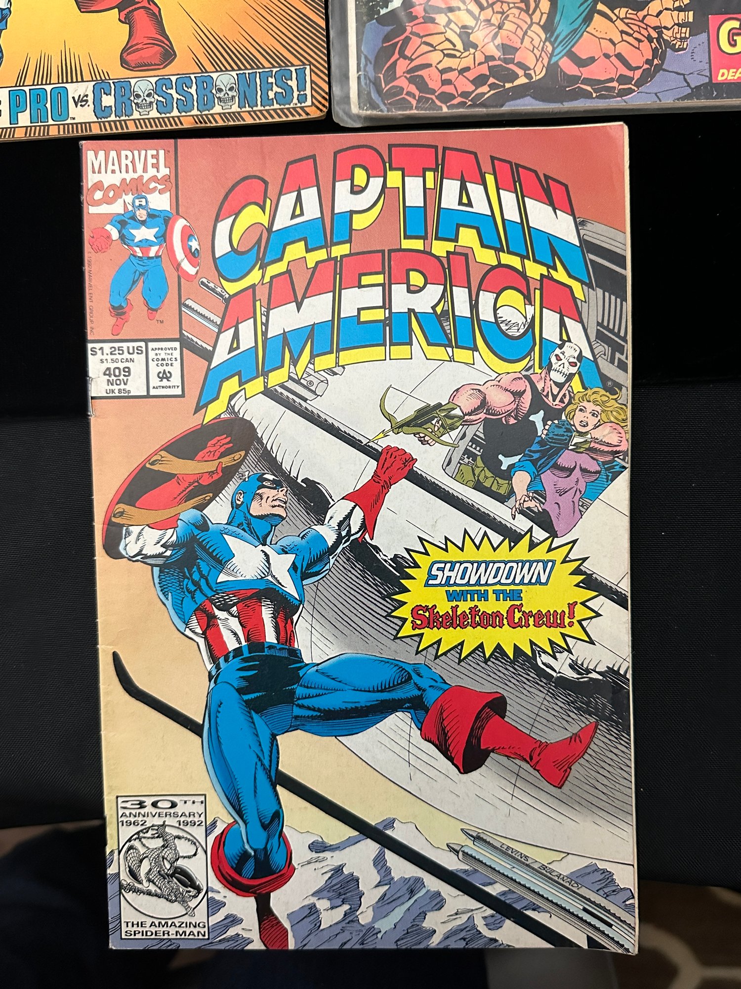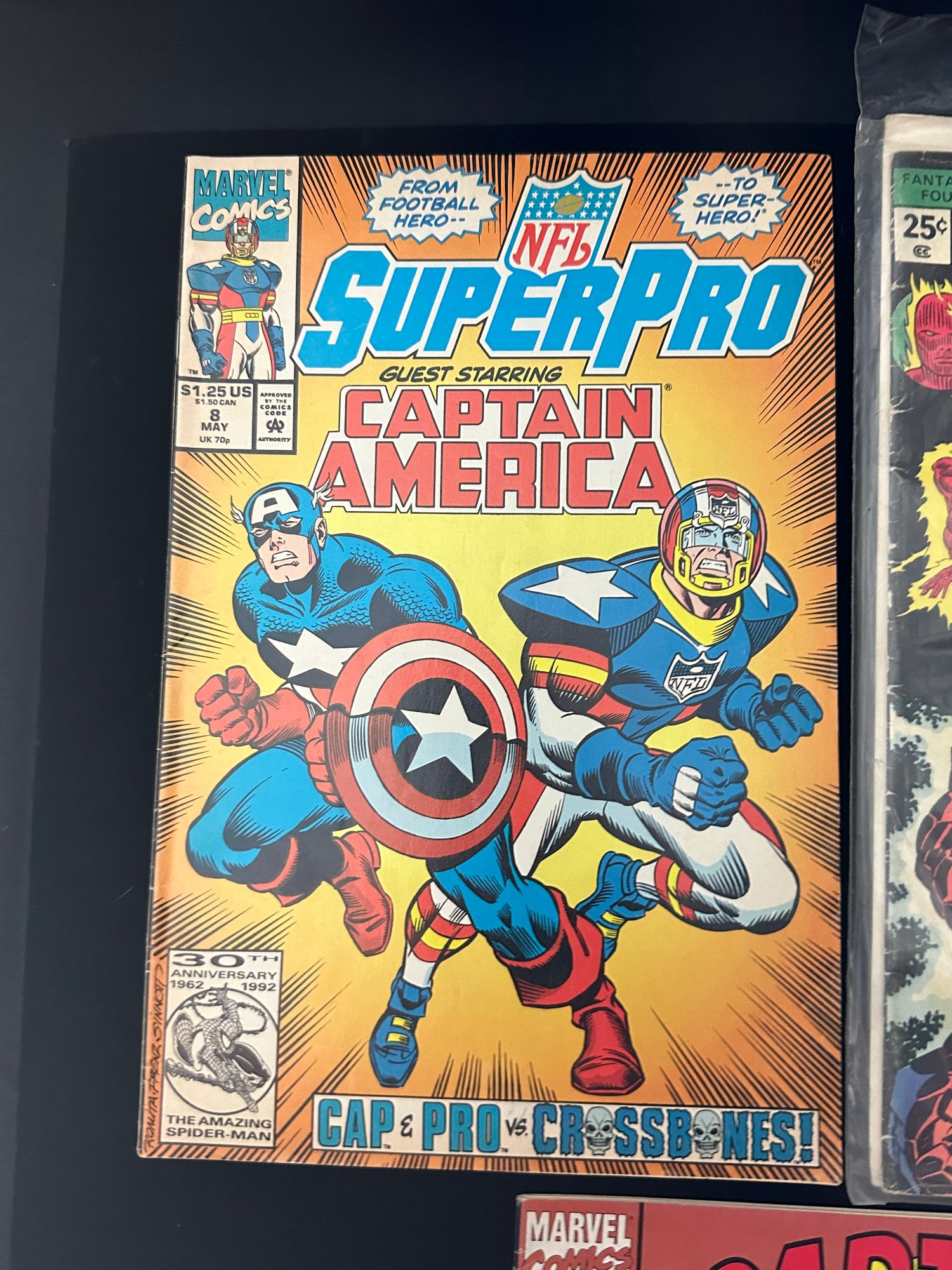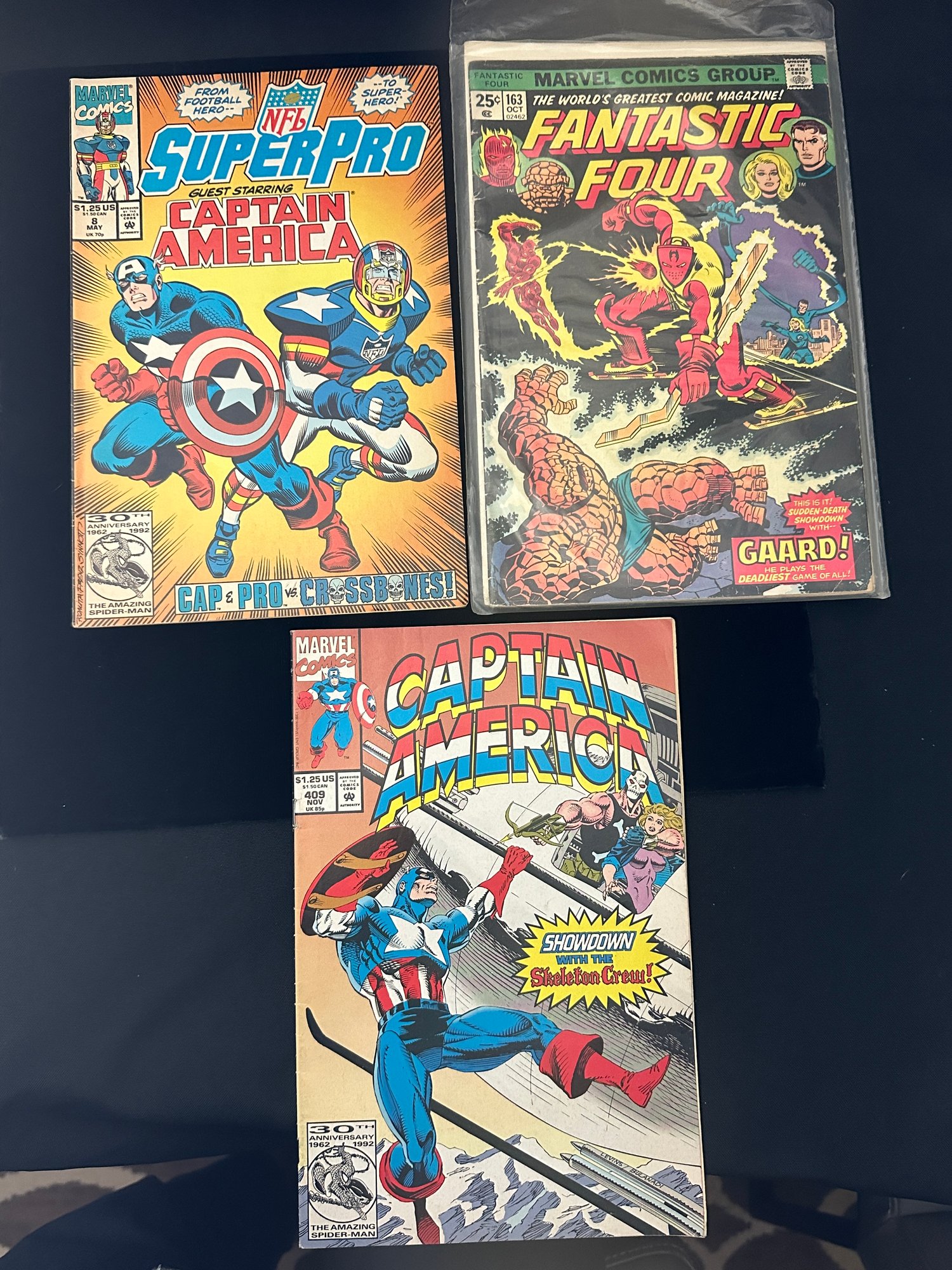 3 Vintage Marvel Comic Books - Fantastic Four, NFL Super Pro Guest Starring Captain America, and Captain America - Fantastic Four (In plastic sleeve) 163 Oct 1975, Captain America 409 Nov. 1992 and NFL uperpro Guest Starring Captain America 30th Anniversary! Cap & Pro vs Crossbones!8 May 1992.