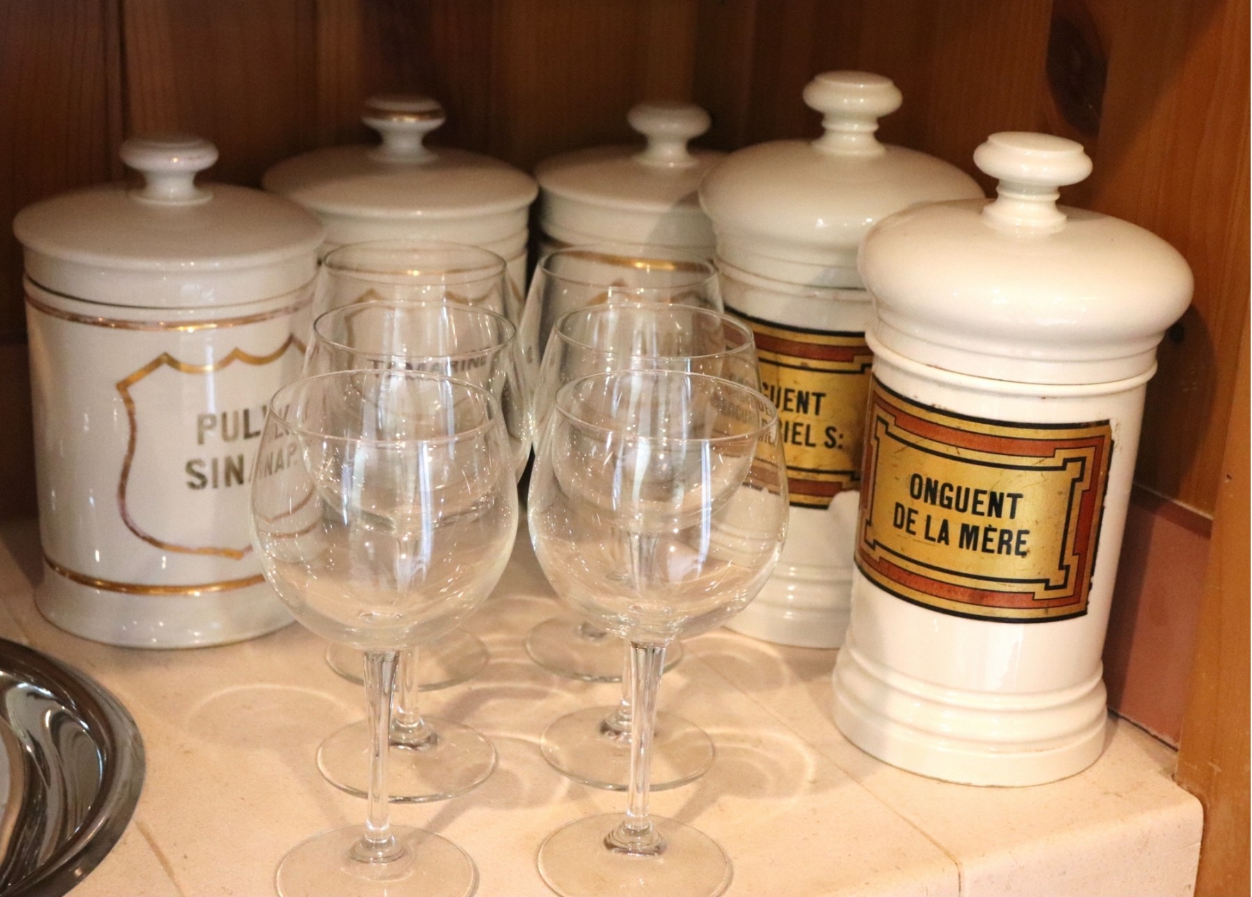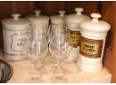5 antique apothecary jars with Latin labels, such as: Tamarind, Smmon Carb., Onguent de la Mere & range in size from 9.5” – 10.75” T. Wine glasses are 8.25” T