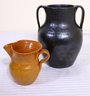 A black glazed Georgia art pottery double handled pitcher and small clay pitcher. Sizes 5.5”x 7”,